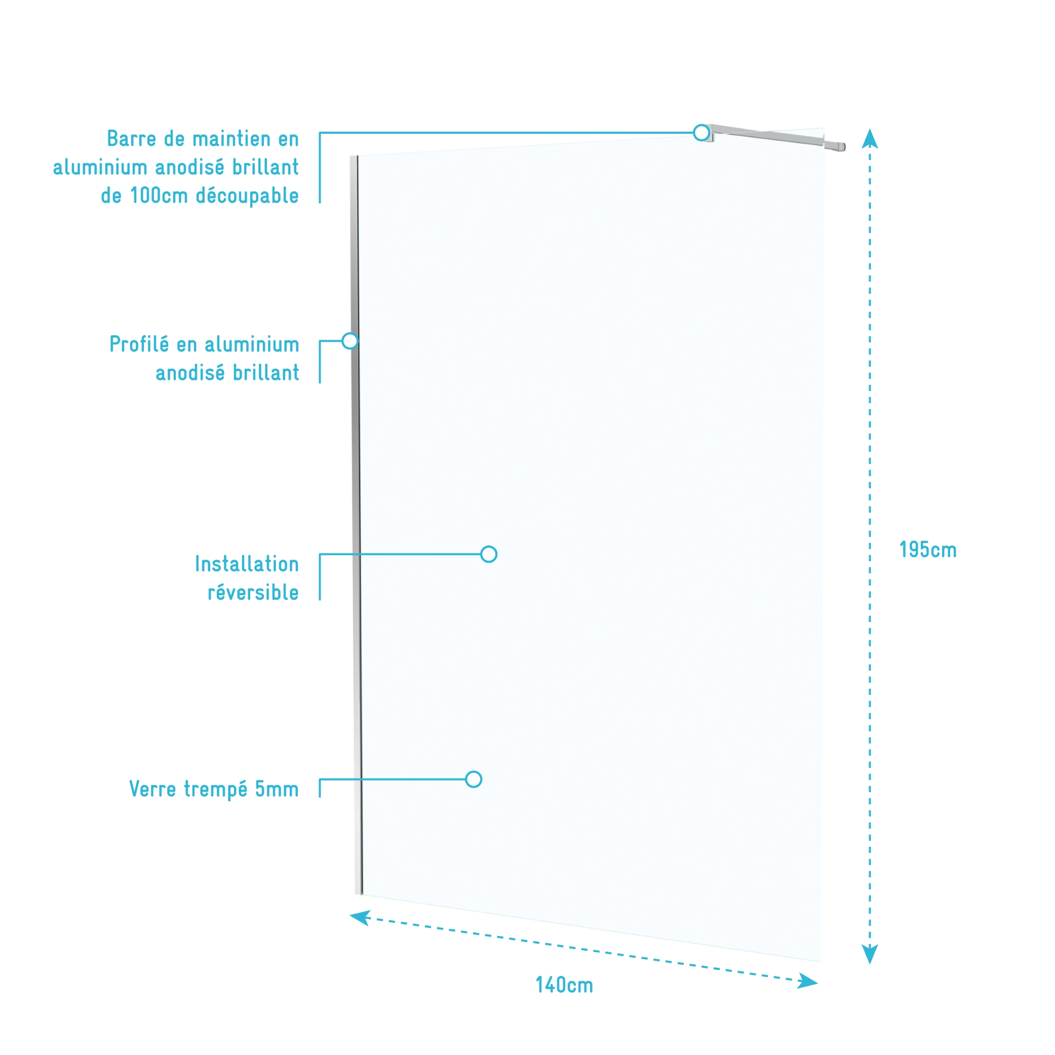 Paroi de Douche 140x195 cm en Verre Trempé 5 mm - Finition Chromé - CHROMED ELEMENTARY