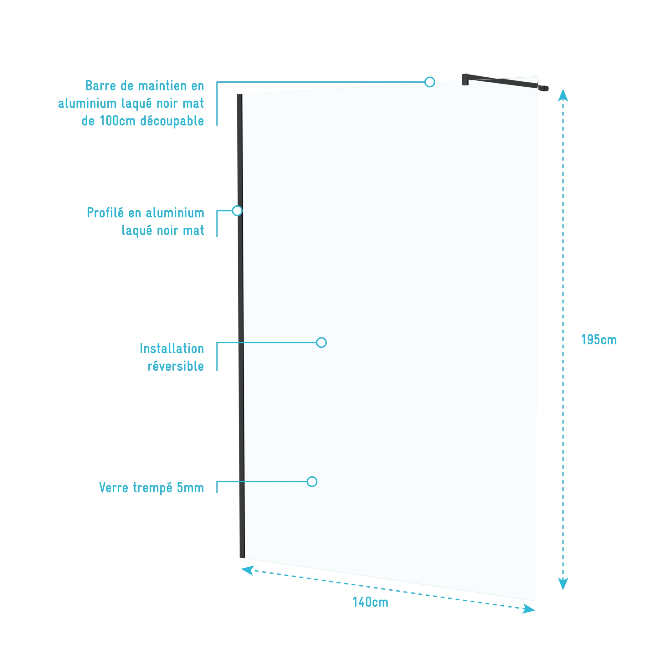 0 avis LEA Paroi de Douche 140x200cm - Verre Anticalcaire - Encadrement Ultra-Fin - Finition Noir Mat - LEA