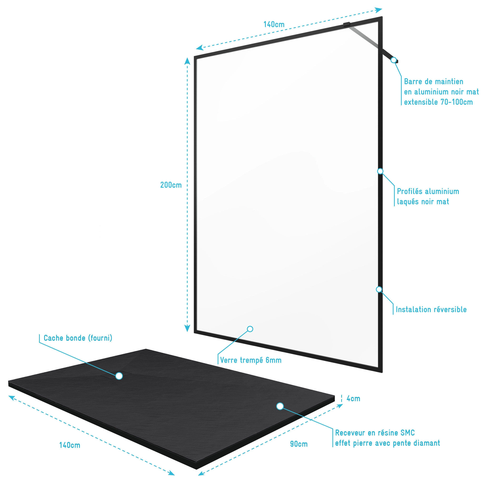 Paroi de douche 140×200 + receveur a poser 140×90 cm + cadre et barre noir mat – CONTOURING 140