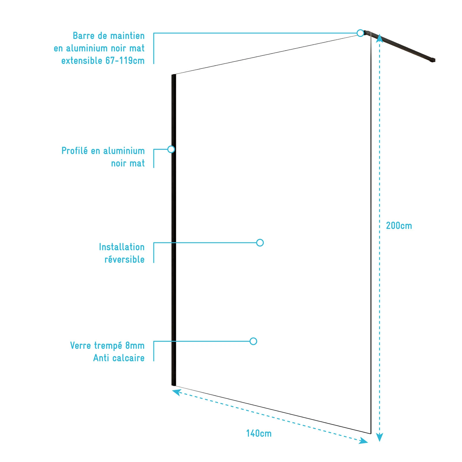 0 avis LEA Paroi de Douche 140x200cm - Verre Anticalcaire - Encadrement Ultra-Fin - Finition Noir Mat - LEA