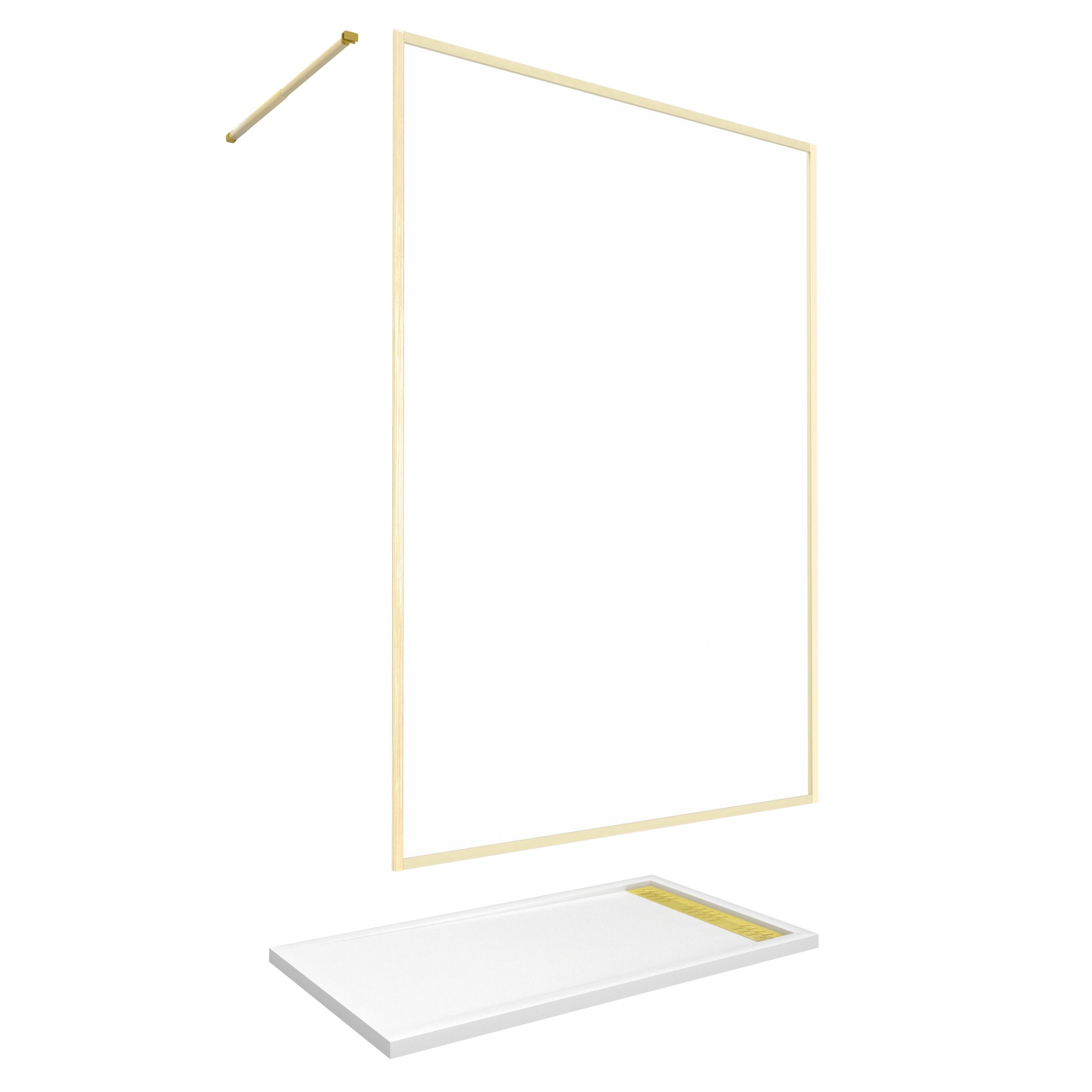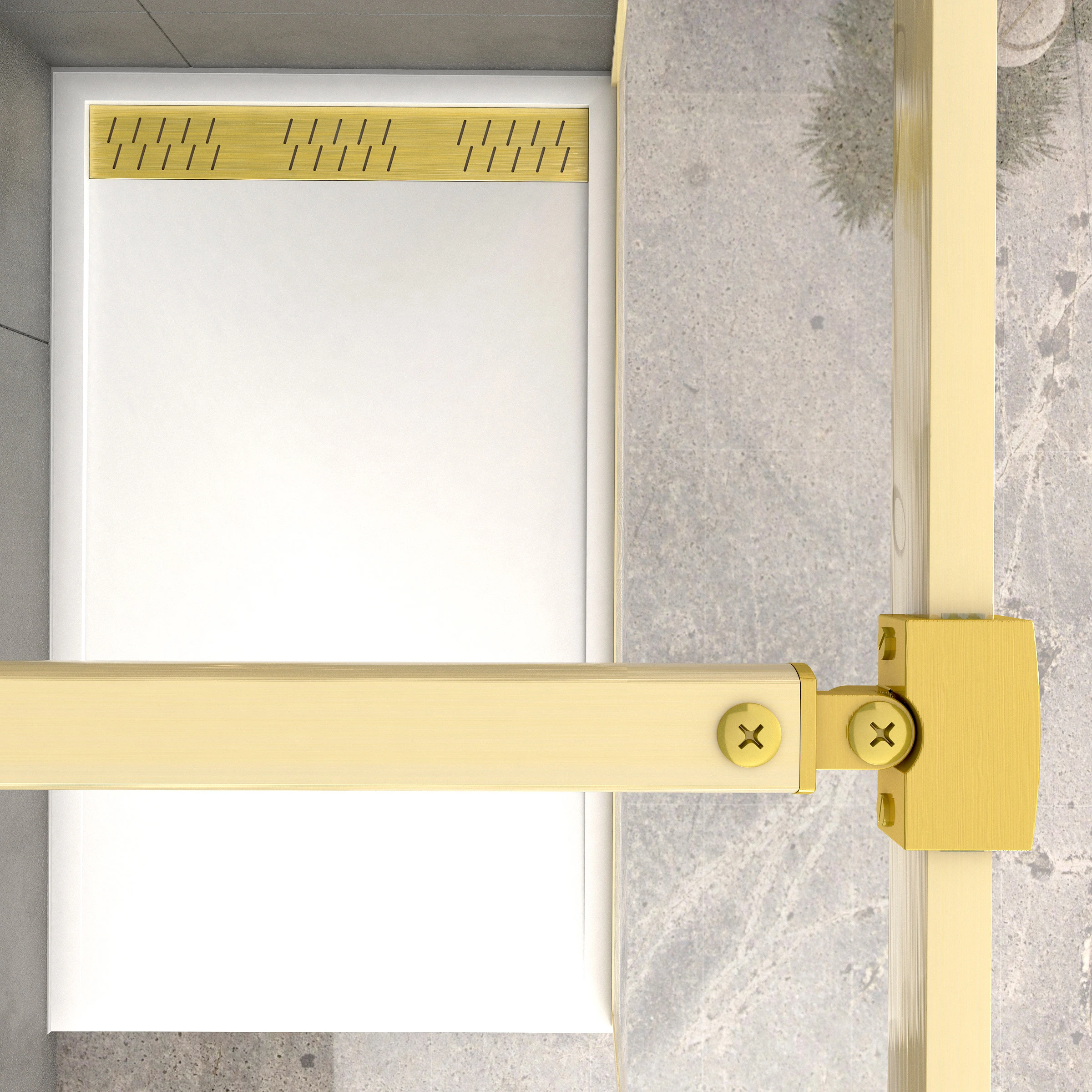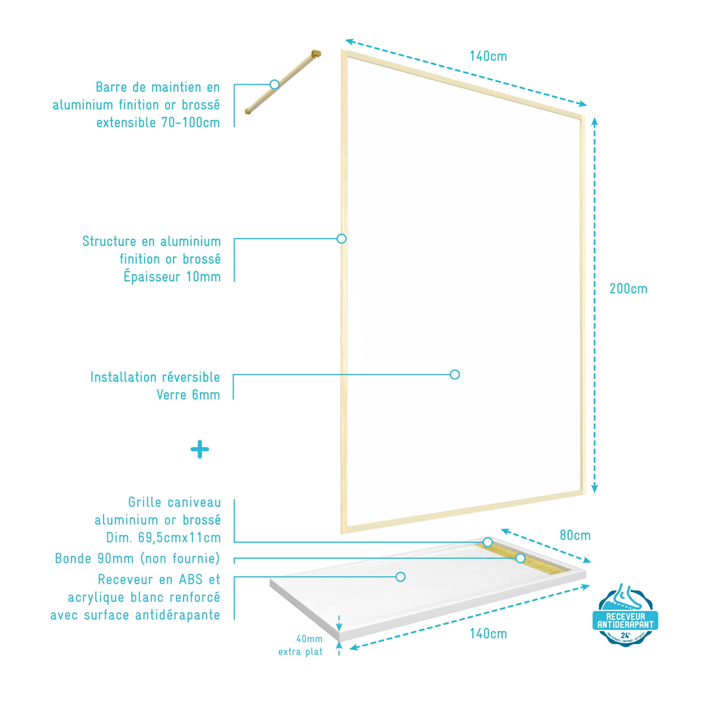 Paroi de Douche 140x200cm + Grille Finition Or Doré Brossé + Receveur Blanc 140x80x5cm