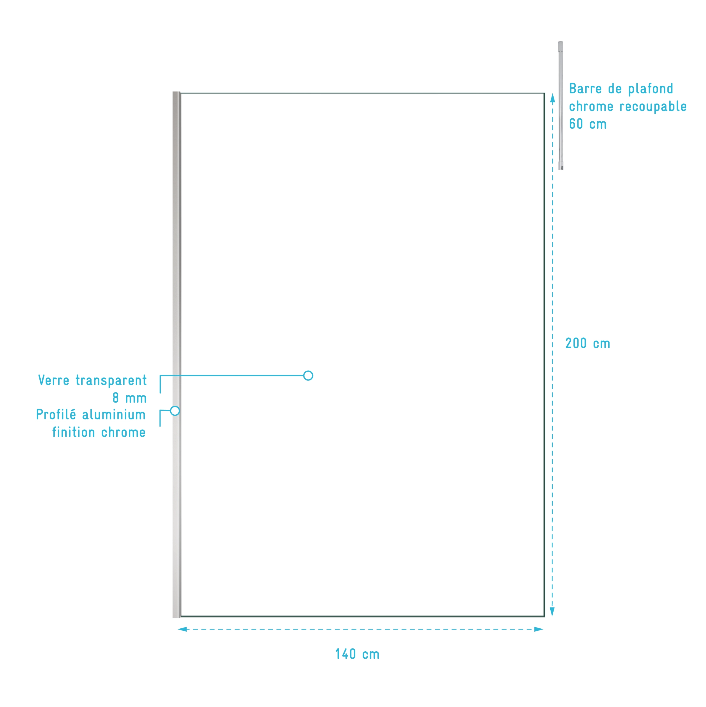 Paroi de Douche 140x200cm Verre Transparent – Profilé + Barre Plafond Finition Chrome – FREEDOM 2