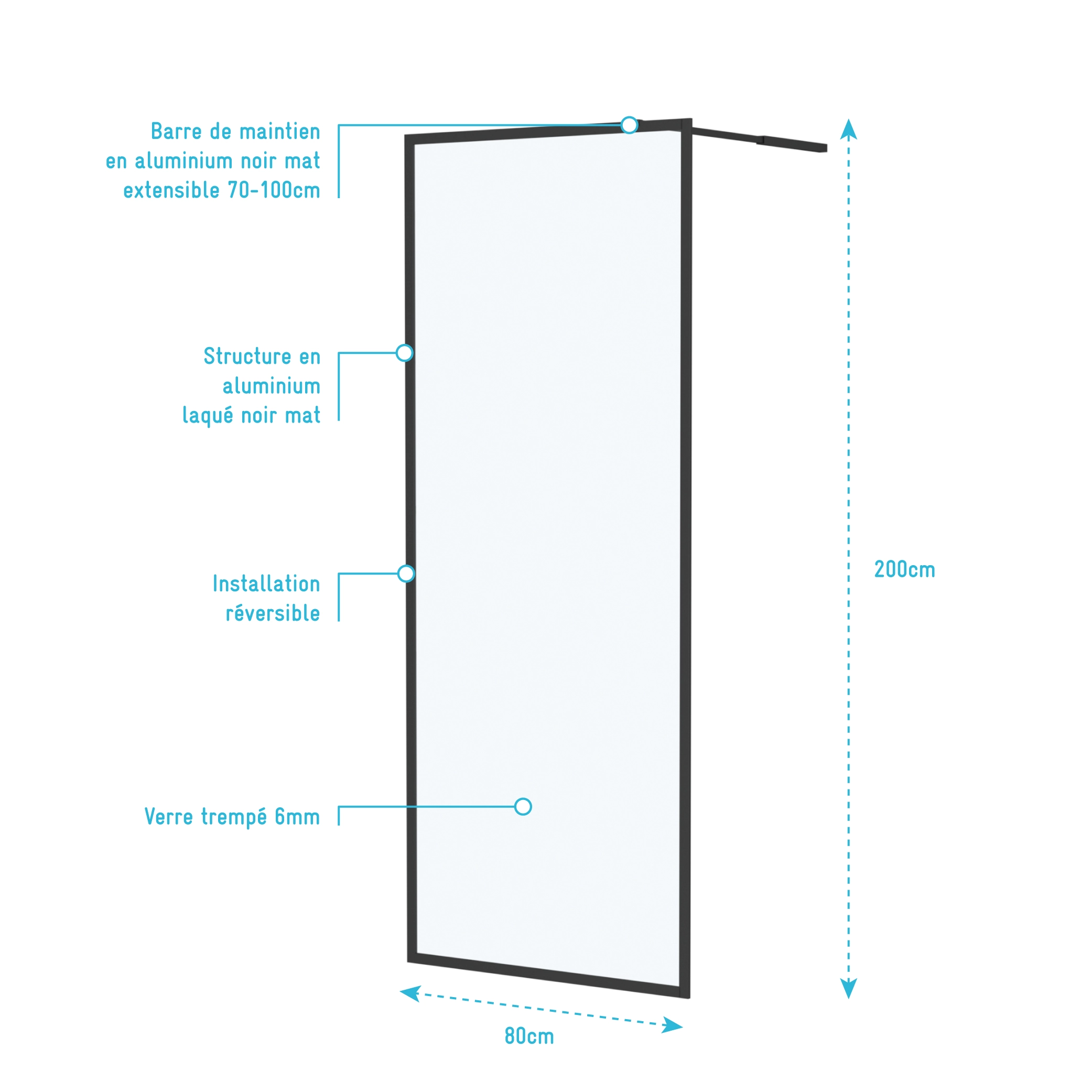Paroi de Douche 80x200 cm - Cadre et Bras Aluminium NOIR MAT - DARK CONTOURING
