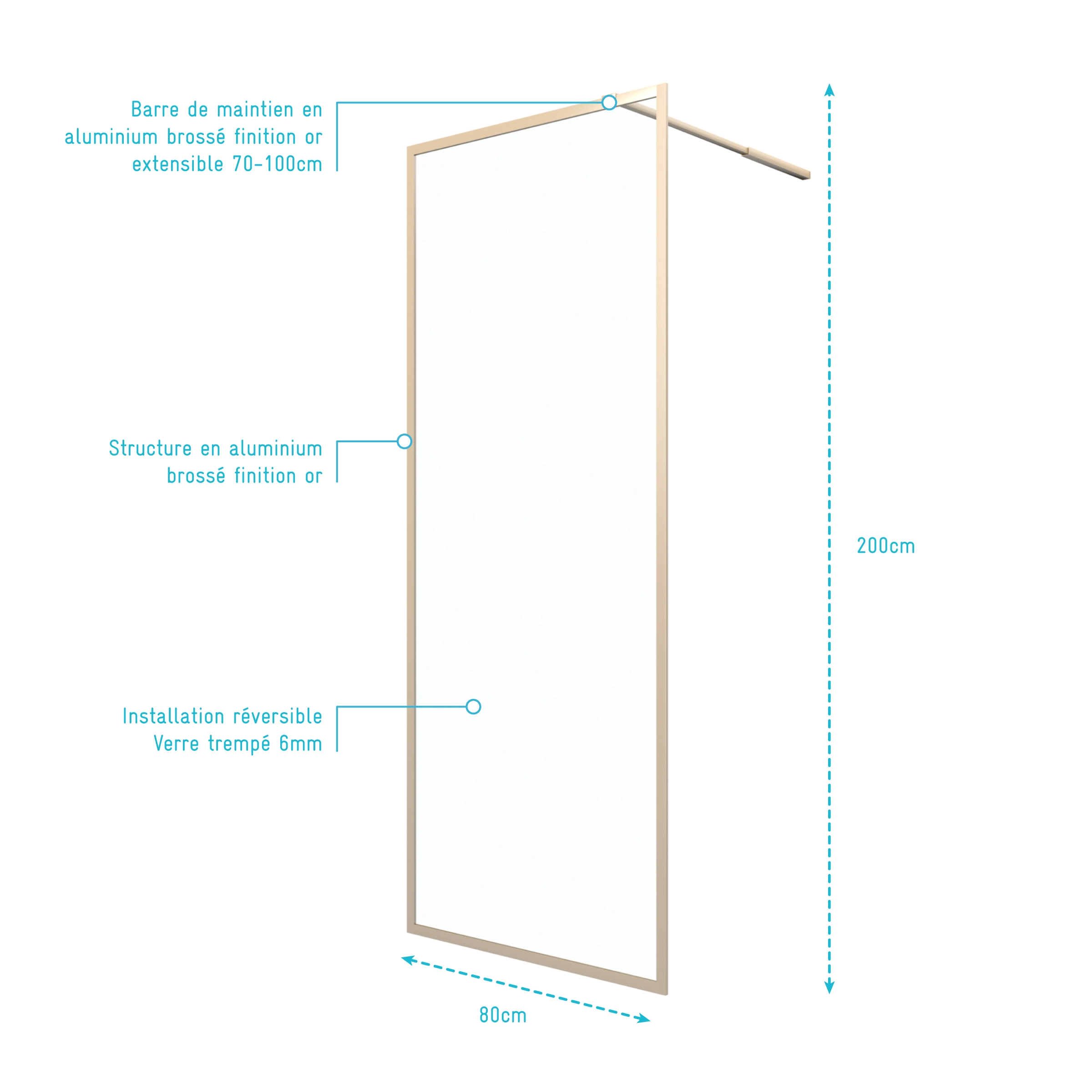 Vous l’attendiez avec impatience ! Succombez à notre nouvelle paroi de douche fixe à l’encadrement finition or brossé. La paroi de douche à l’italienne, moderne et incontournable, a l’avantage de faciliter l’accès à la douche ainsi que de rendre votre pièce plus lumineuse et spacieuse.