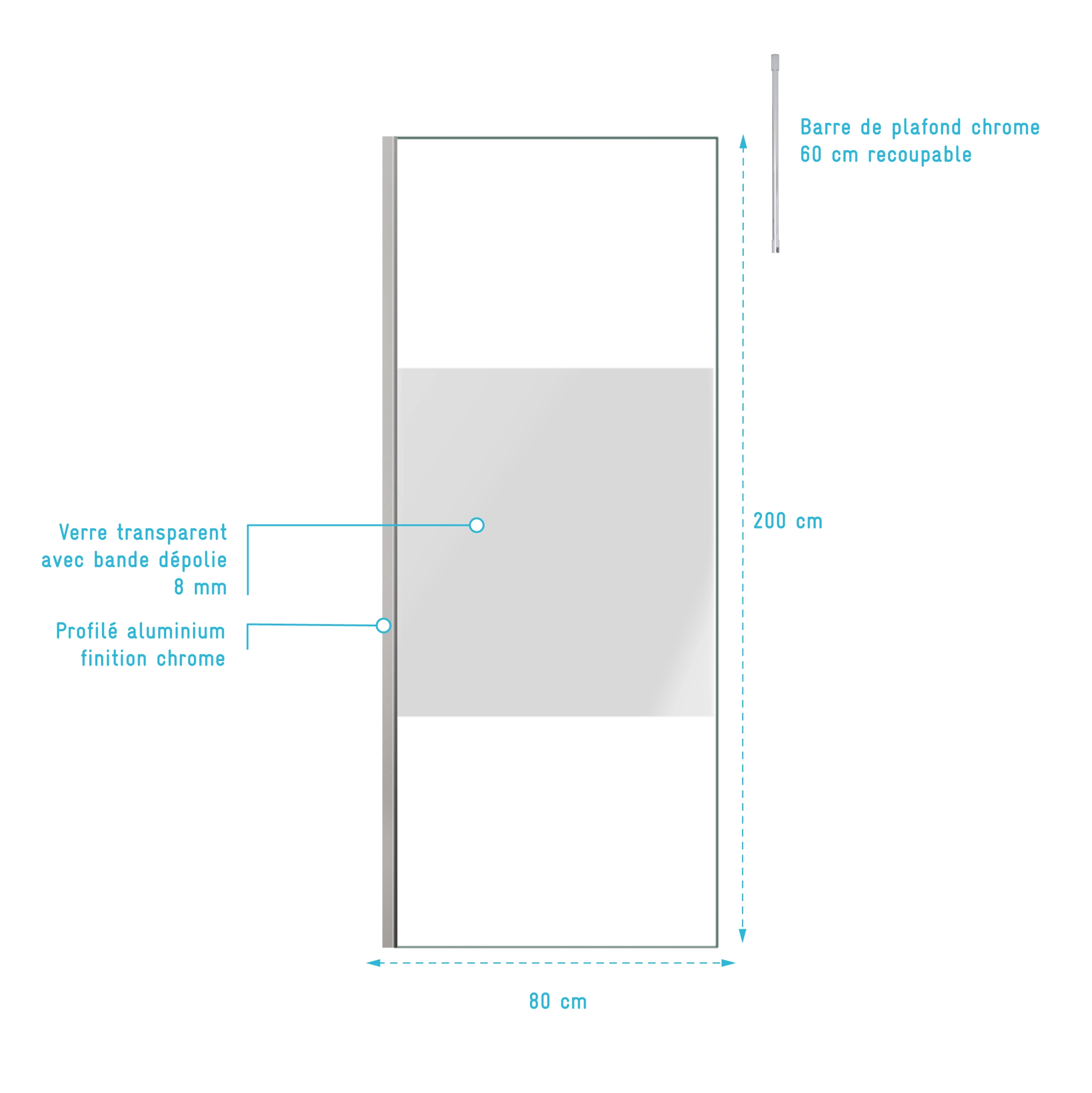 Paroi de Douche 80x200cm Dépolie – Profilé + Barre Plafond Finition Chrome – FREEDOM 2 FROSTED