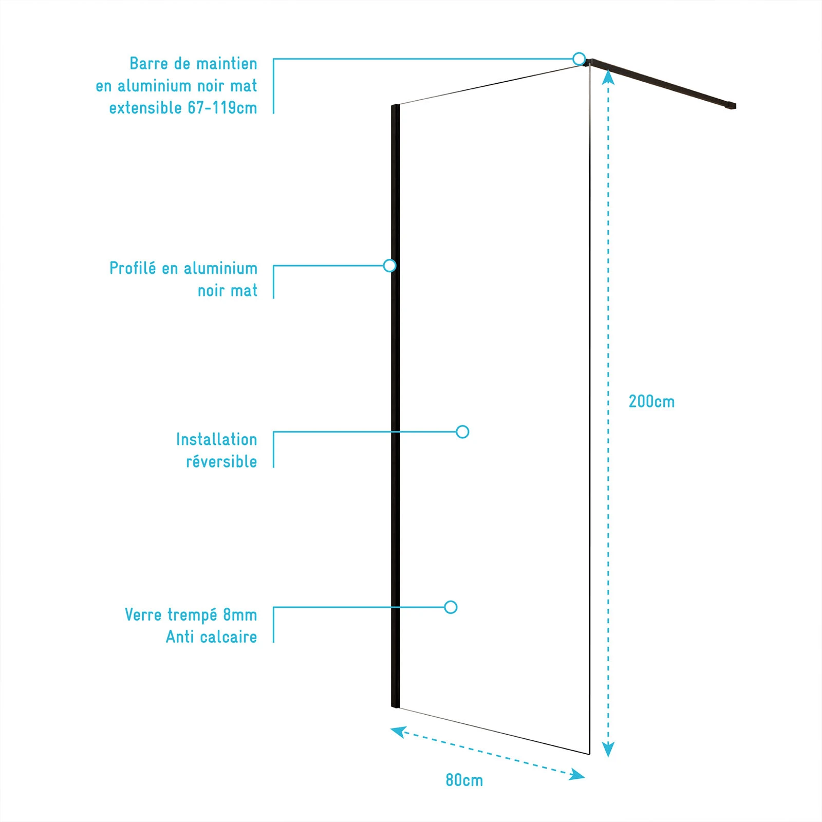 3 avis pour Paroi de Douche 80x200cm en Verre Trempé Transparent 8mm Anticalcaire – Profilé Noir Mat – LINA