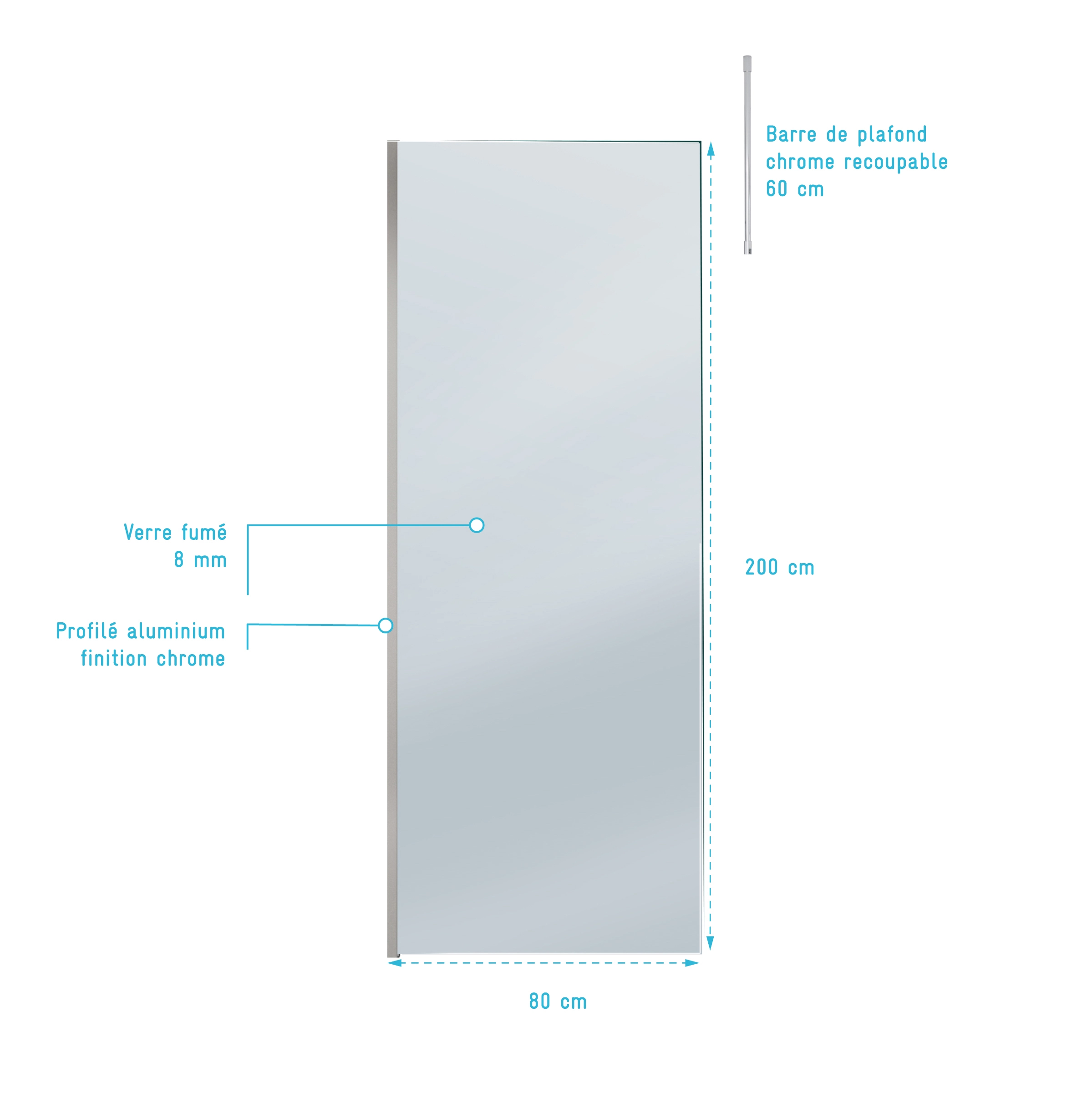 Paroi de Douche 80x200cm Verre Fumé – Profilé + Barre Plafond Finition Chrome – FREEDOM 2 SMOKED