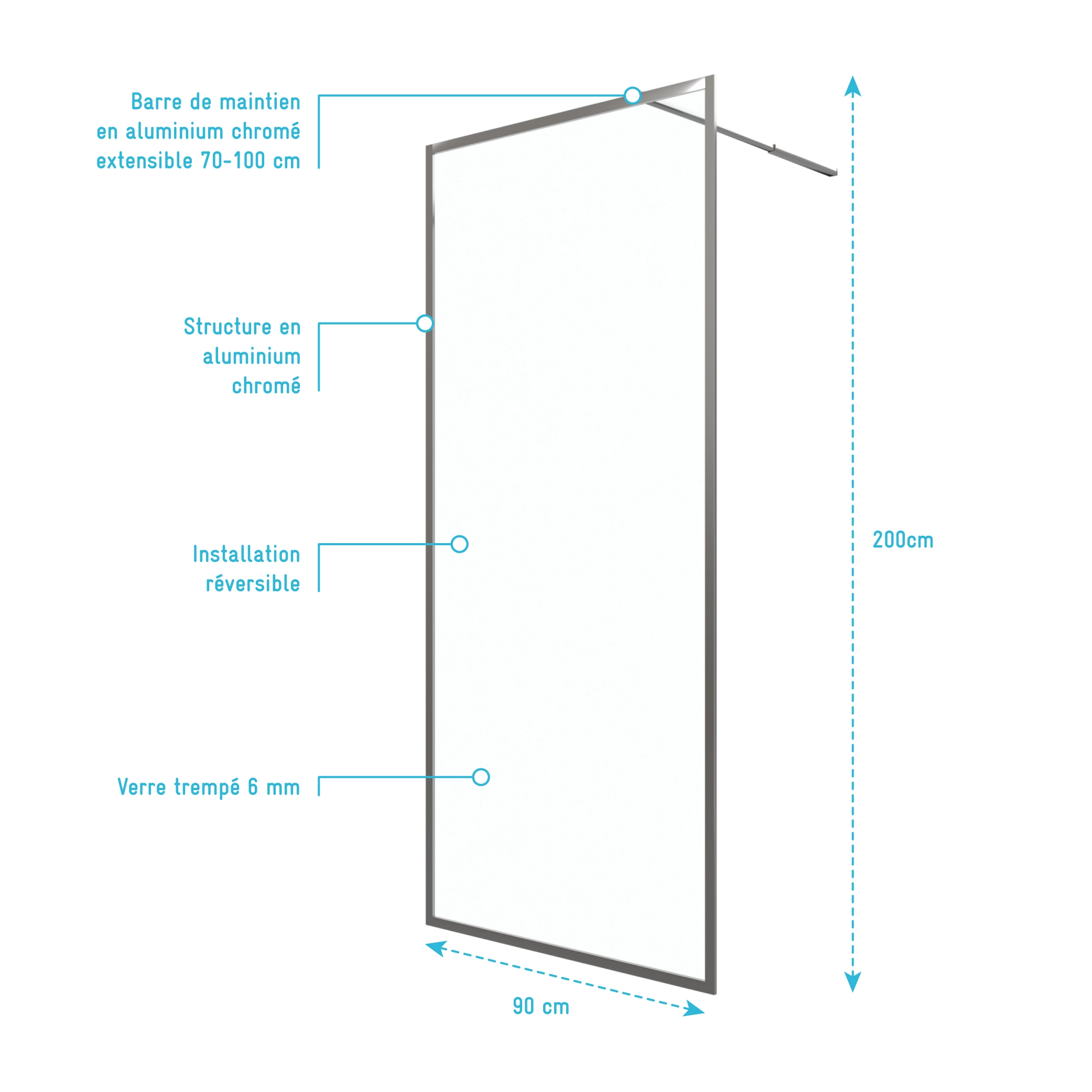 Paroi de Douche 90×200 cm – Cadre et Bras Aluminium Chrome – CHROMED CONTOURING