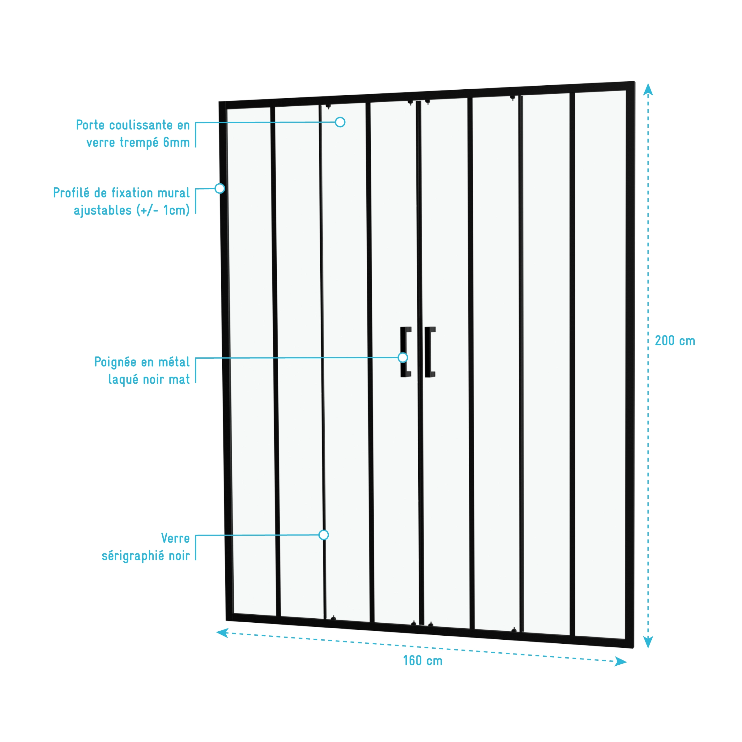Paroi de douche 2 portes coulissantes 160×200 cm – Verre sérigraphié – Profilé Noir – CRUSHX