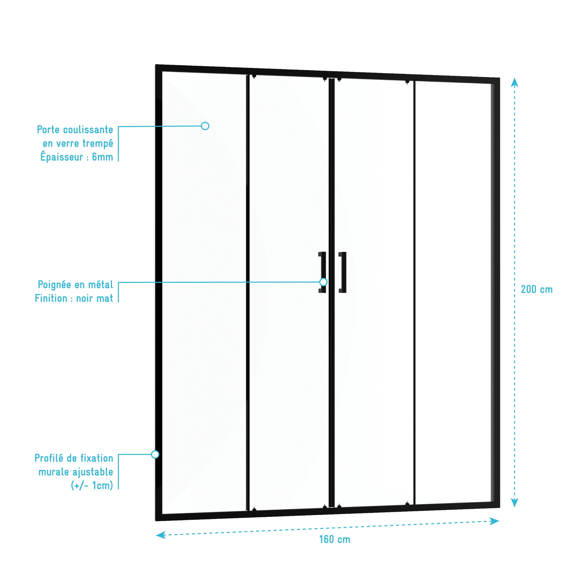 Porte de douche Double Coulissant 160×200 cm – Verre transparent – Profilé Noir – CRUSH