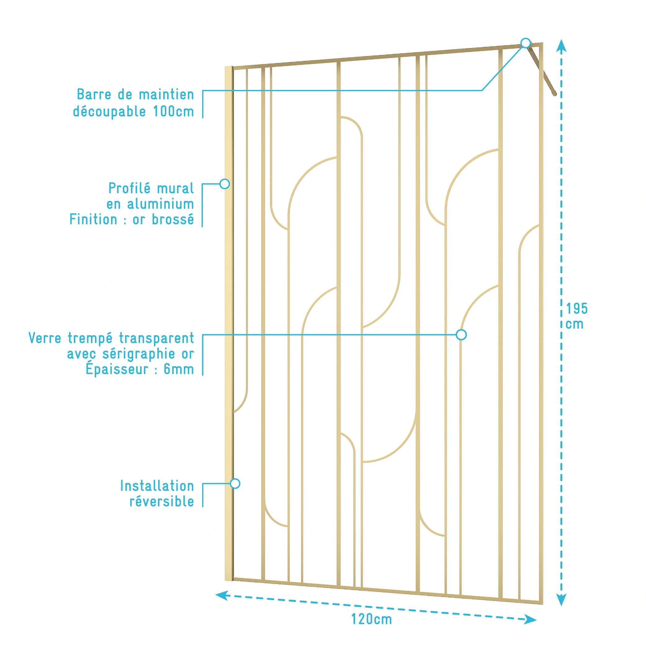 Découvrez l’élégance indémodable de l’Art Déco avec notre paroi de douche GATSBY en finition doré. Nous avons imaginé cette paroi comme étant un mariage parfait entre le style vintage et la sophistication moderne. Avec ses motifs géométriques raffinés sérigraphiés en doré, cette pièce sublimera votre salle de bains. La texture du profilé mural subtilement brossée offre une esthétique délicate et captivante.