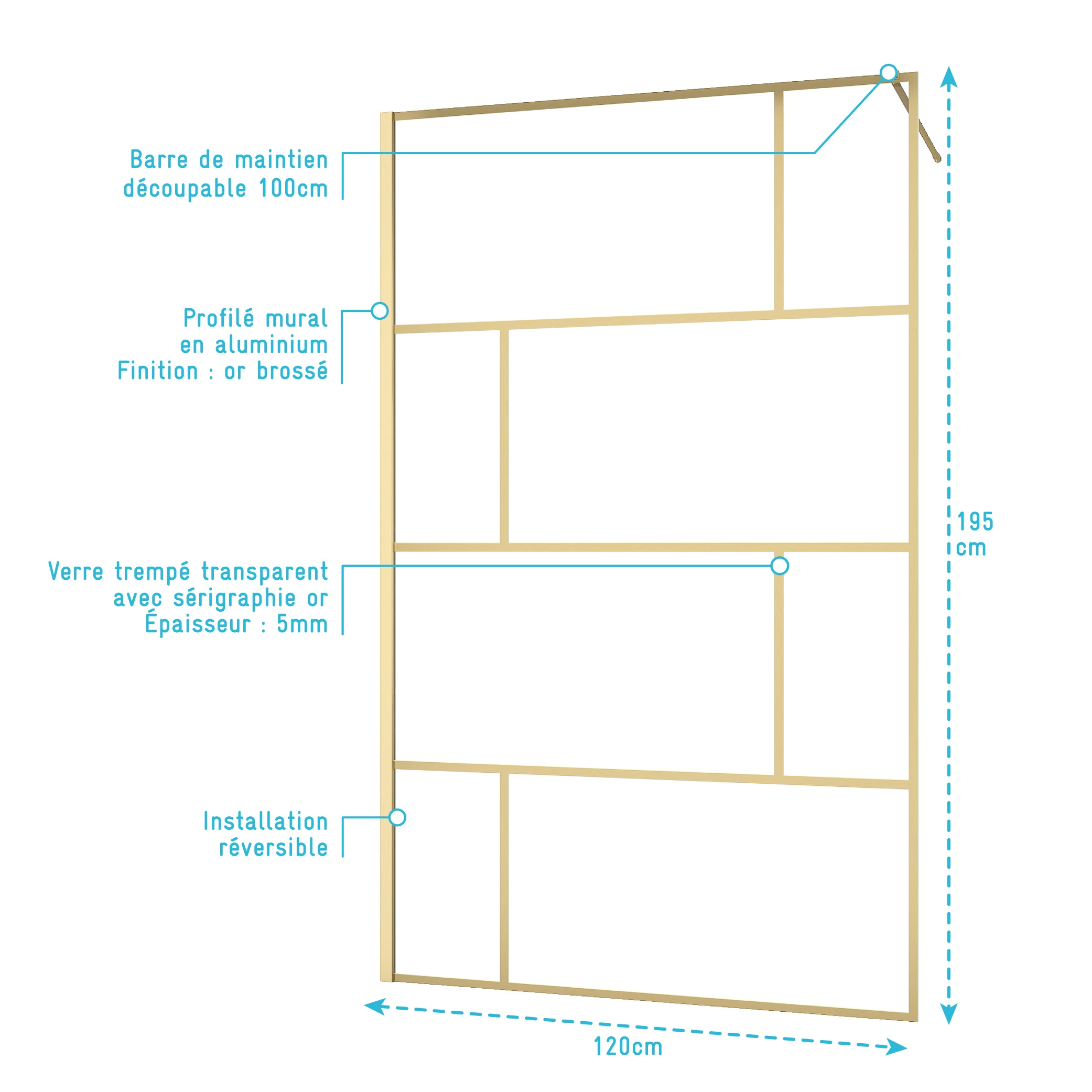 Notre modèle de paroi de douche BLOCKS est l’un de nos best-sellers. Pour vous offrir encore plus de choix, nous avons étendu la gamme en vous proposant la paroi en finition dorée ! Nous avons imaginé cette paroi comme étant une alliance parfaite entre graphisme et sophistication moderne. Le doré apporte une allure luxueuse et contemporaine à votre salle de bains. Ajoutez une touche d’éclat et de sophistication dans votre salle de bain !