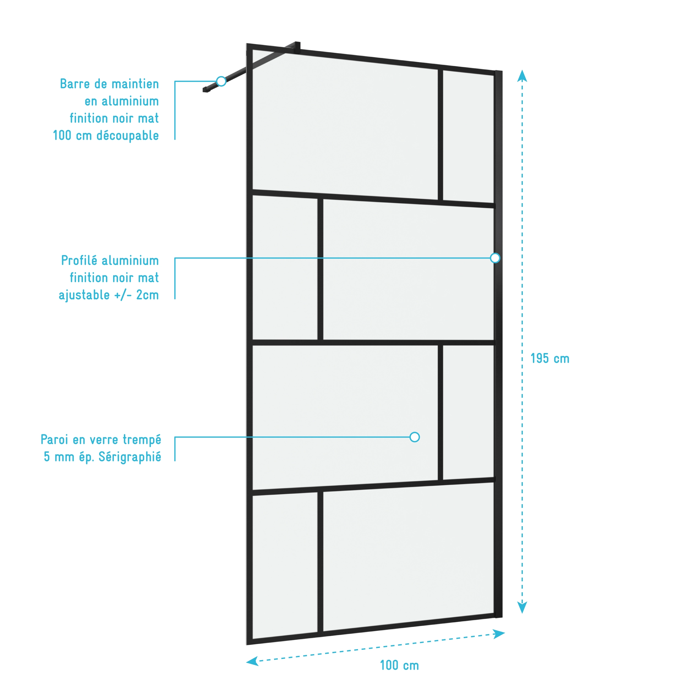 11 avis pour Paroi de douche a l’italienne serigraphie type Brique – 100x195cm – Profile noir mat – verre 5mm
