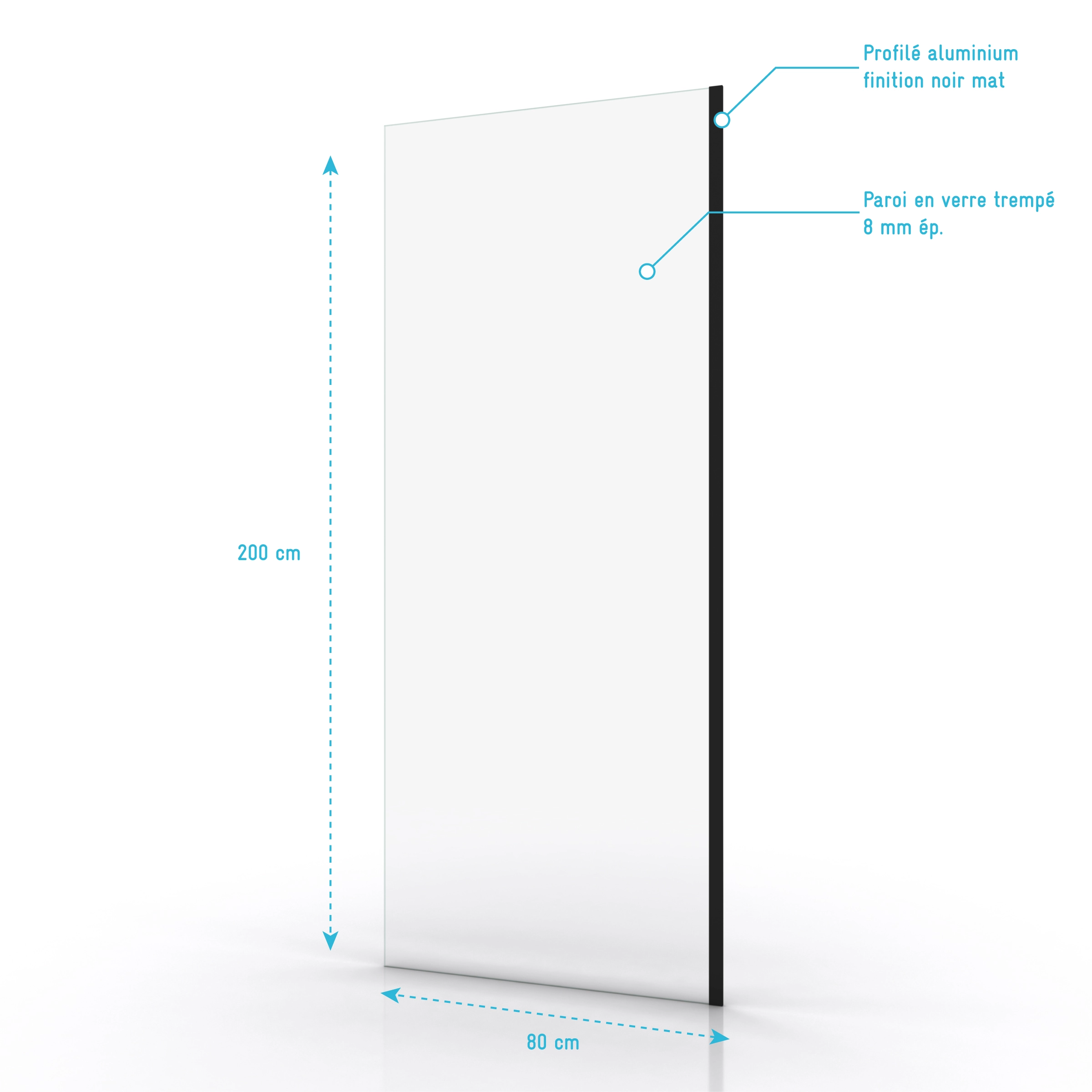 Paroi de douche 80x200 cm type Verriere - Verre trempe et Structure aluminium noir mat - GLASSY