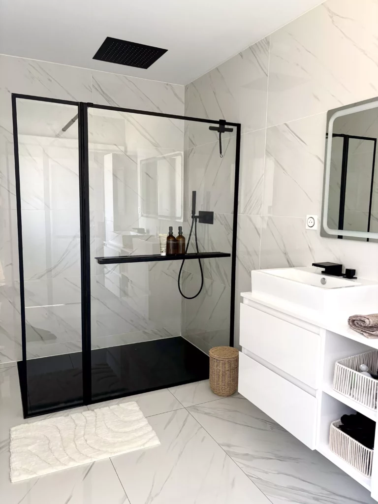 Conseil déco : Sublimez votre salle de bain en associant la robinetterie à la couleur de l’encadrement de la paroi pour une harmonie visuelle parfaite.