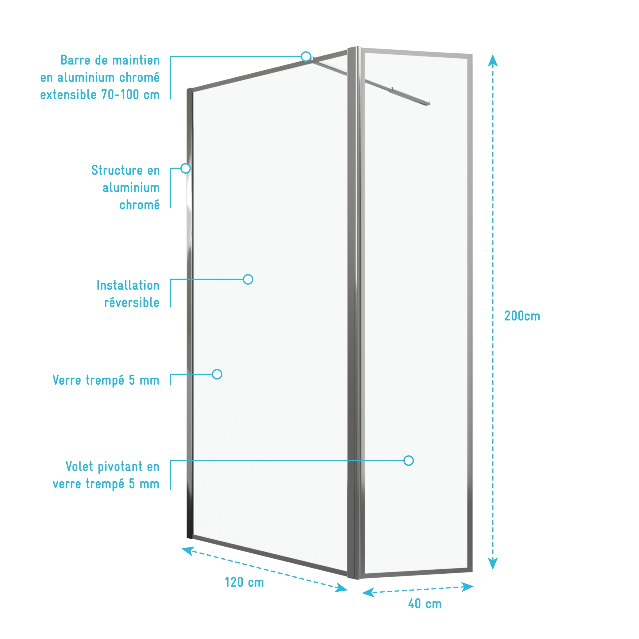 Paroi de Douche avec Volet Pivotant 120+40x200cm – Finition Chromée – CHROMED CONTOURING