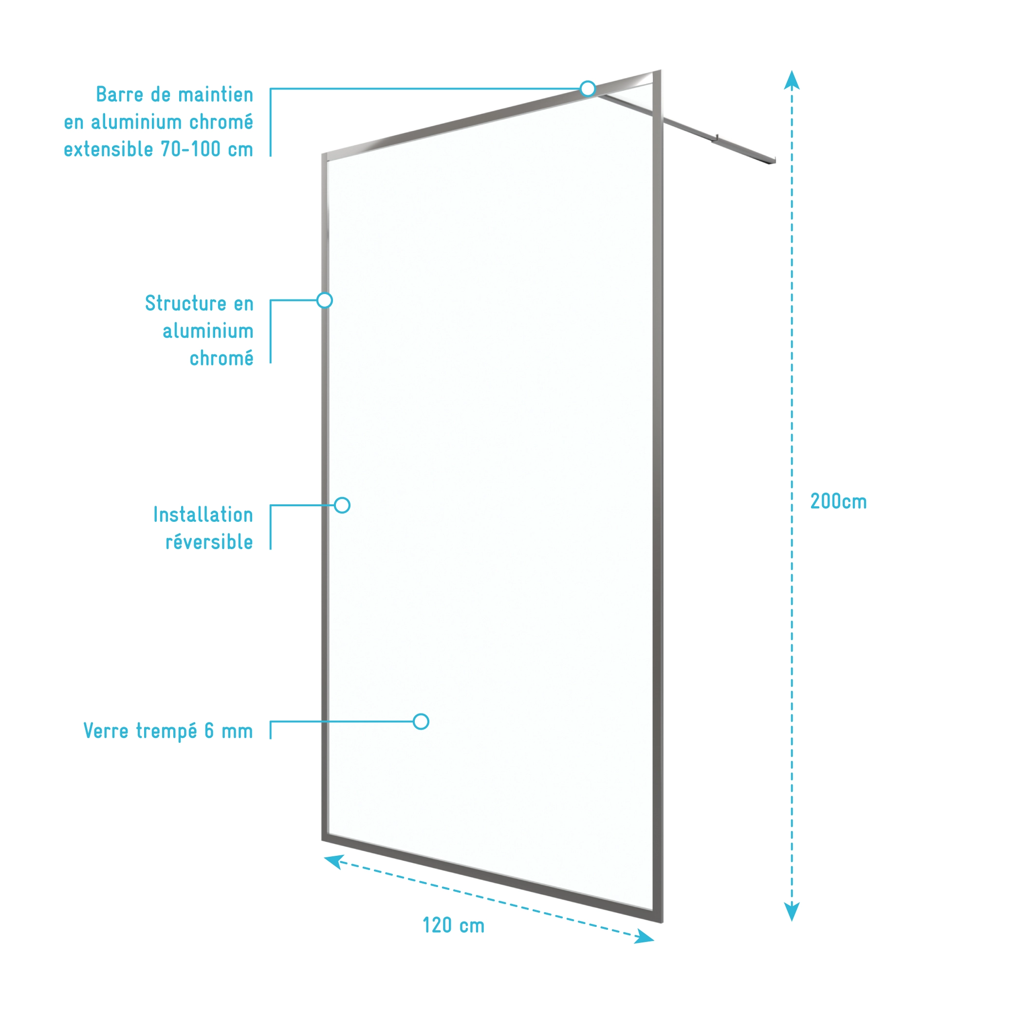 Paroi de Douche 120×200 cm – Cadre et Bras Aluminium Chrome – CHROMED CONTOURING