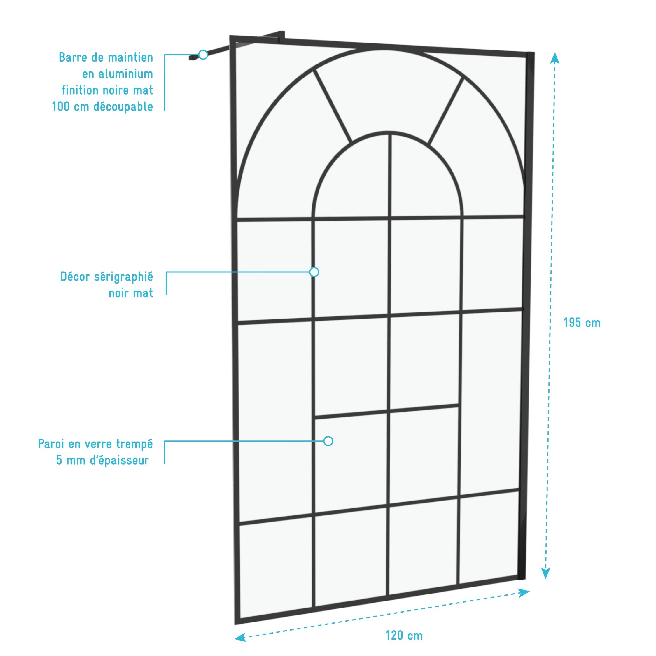 12 avis pour Paroi de douche Déco 120x195cm Verre 5mm Sérigraphié – Barre de fixation Noir Mat