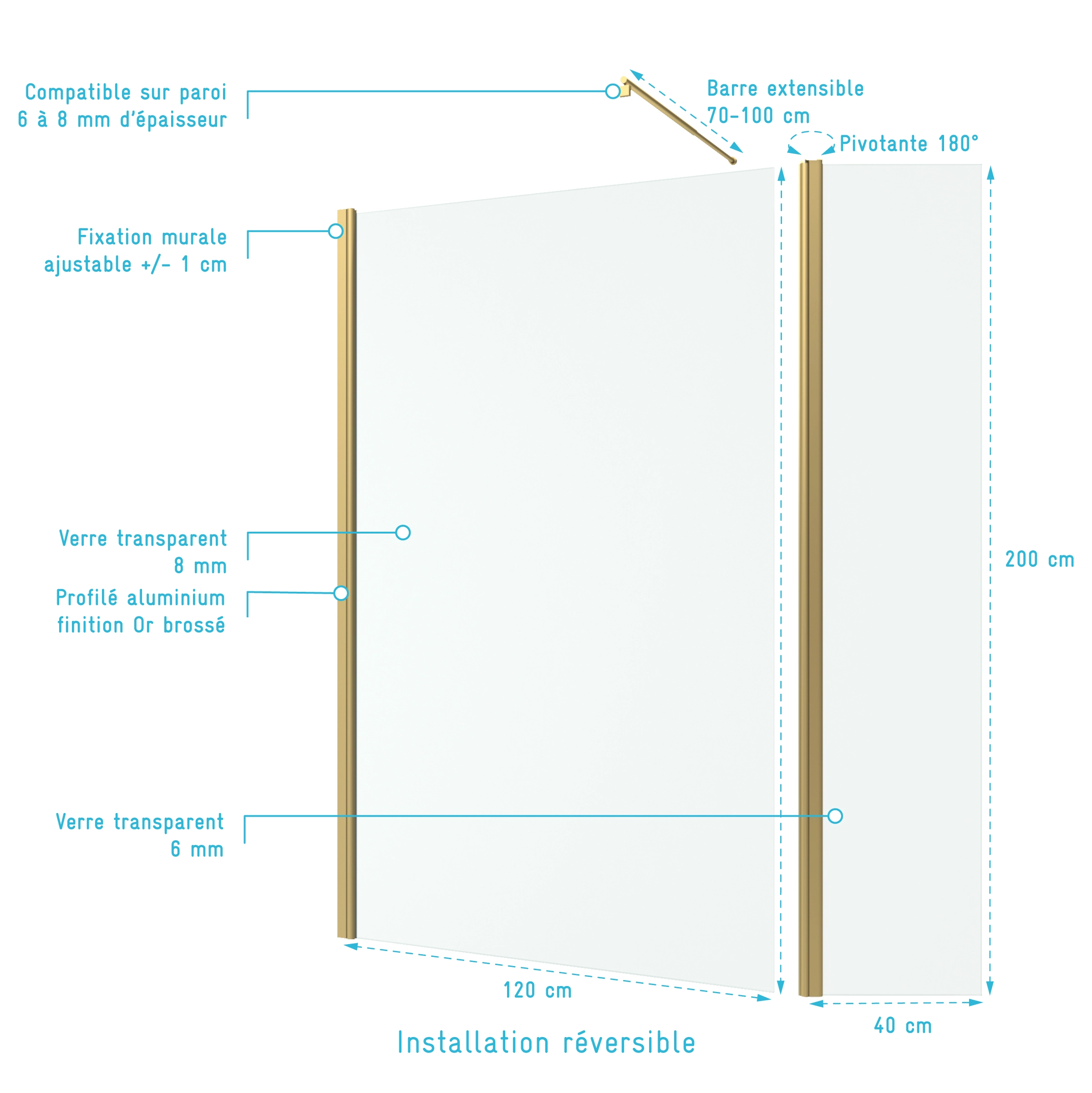 Paroi de Douche 120x195 cm en Verre Trempé 5 mm - Finition Or Brossé - GOLD ELEMENTARY