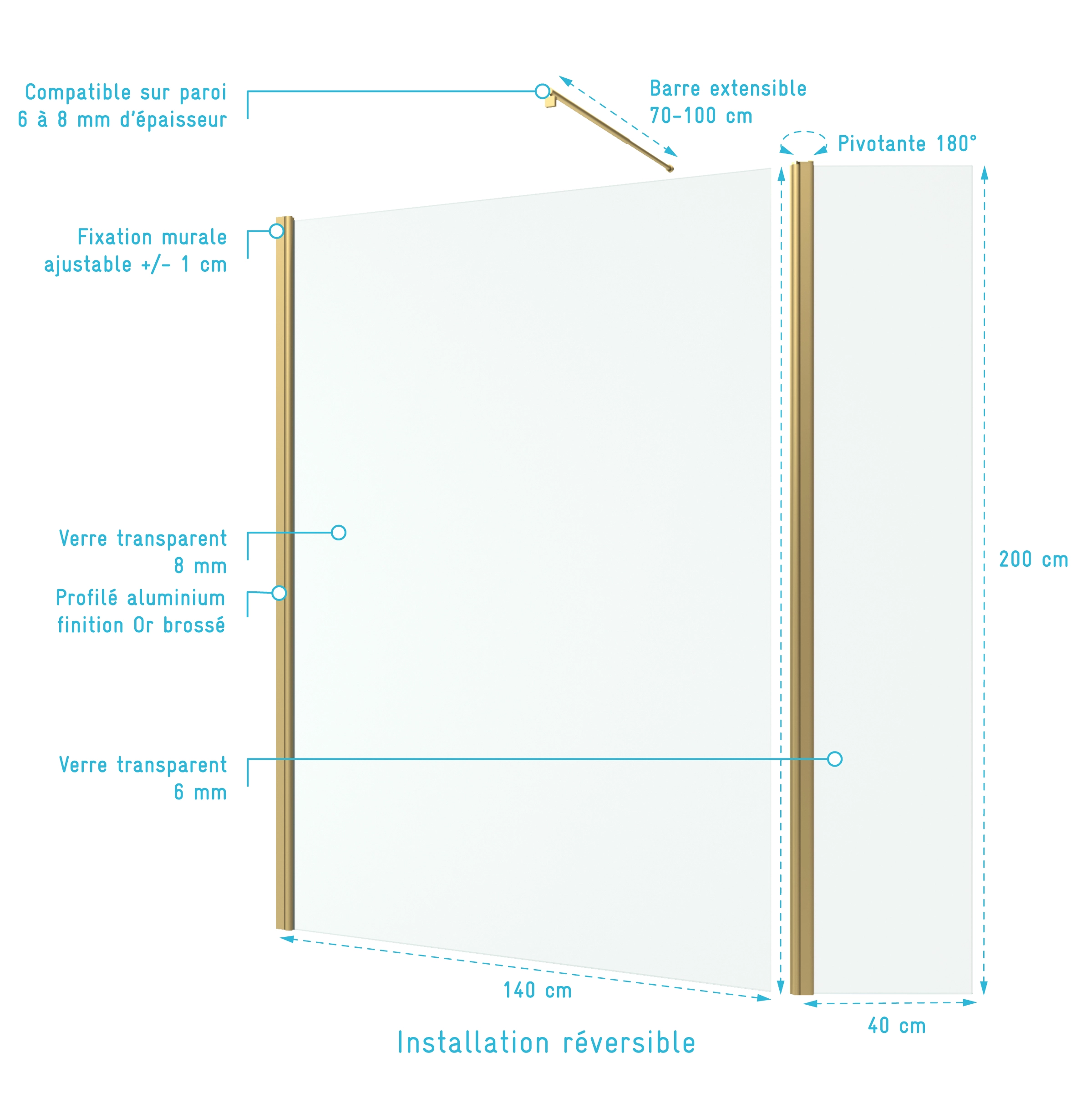 - Paroi fixe : 140×200 cm (8 mm)