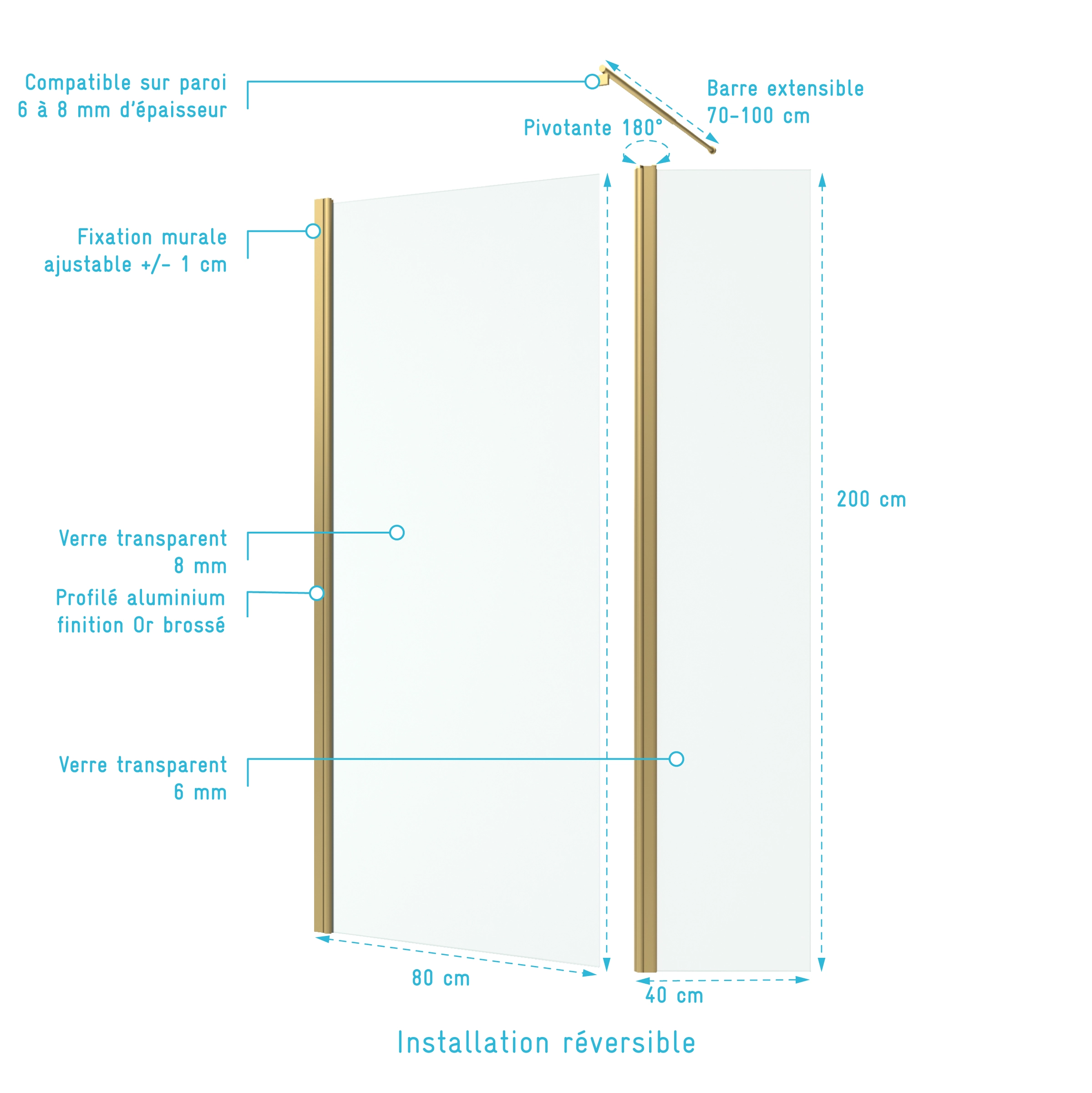 La paroi de douche à l’italienne, moderne et incontournable, à l’avantage de faciliter l’accès à la douche tout en rendant votre pièce plus lumineuse et spacieuse. Pratique, le volet pivotant de 40 cm empêche les projections d’eau dans la salle de bain.