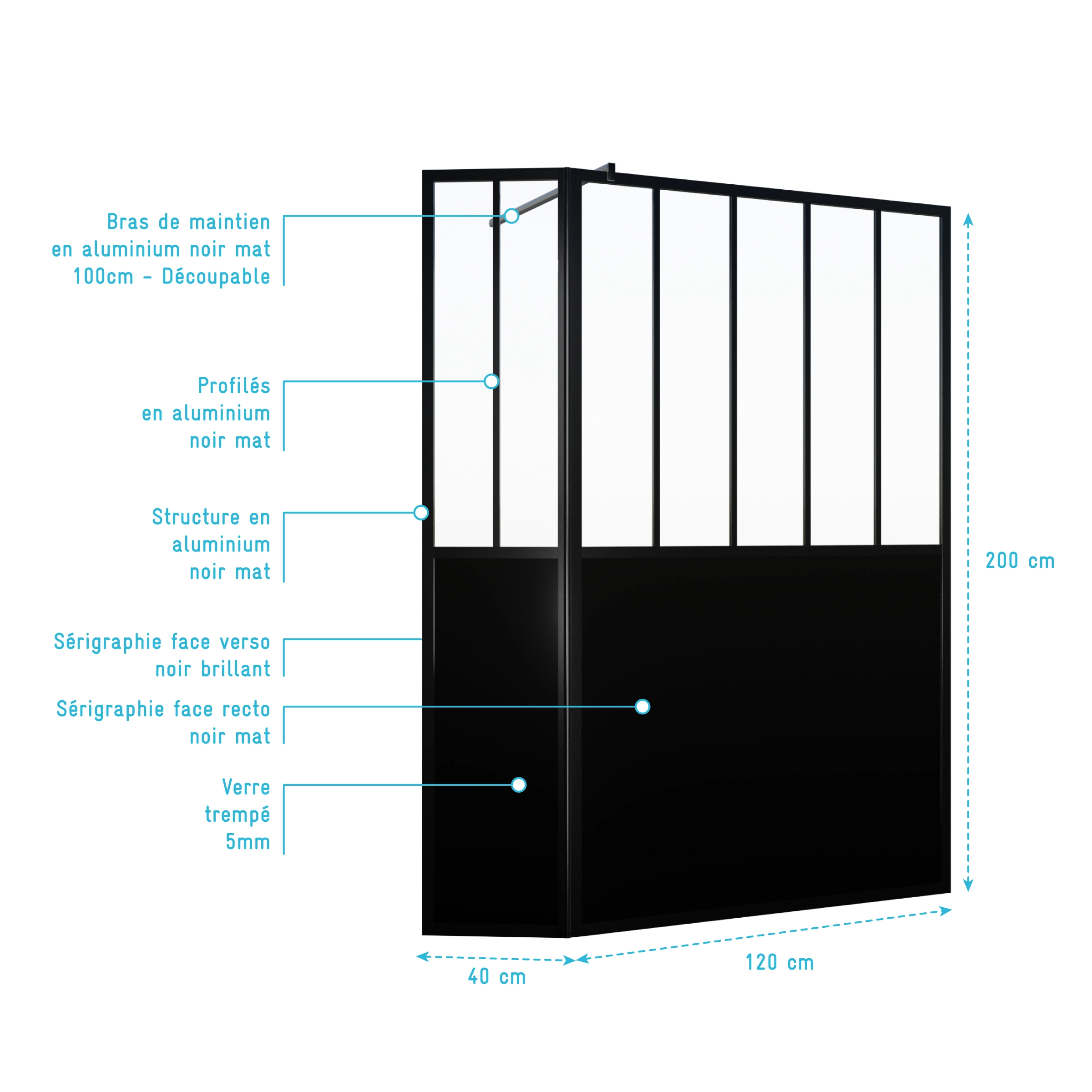 Paroi de Douche Façon Verrière avec Volet Pivotant – 120+40×200 cm – Verre Transparent et Noir