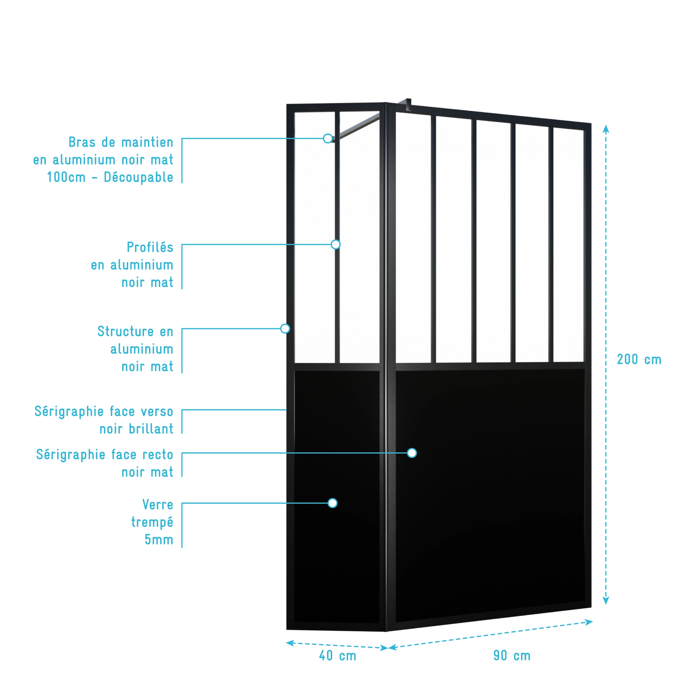Paroi de Douche Façon Verrière avec Volet Pivotant - 90+40x200 cm - Verre Transparent et Noir