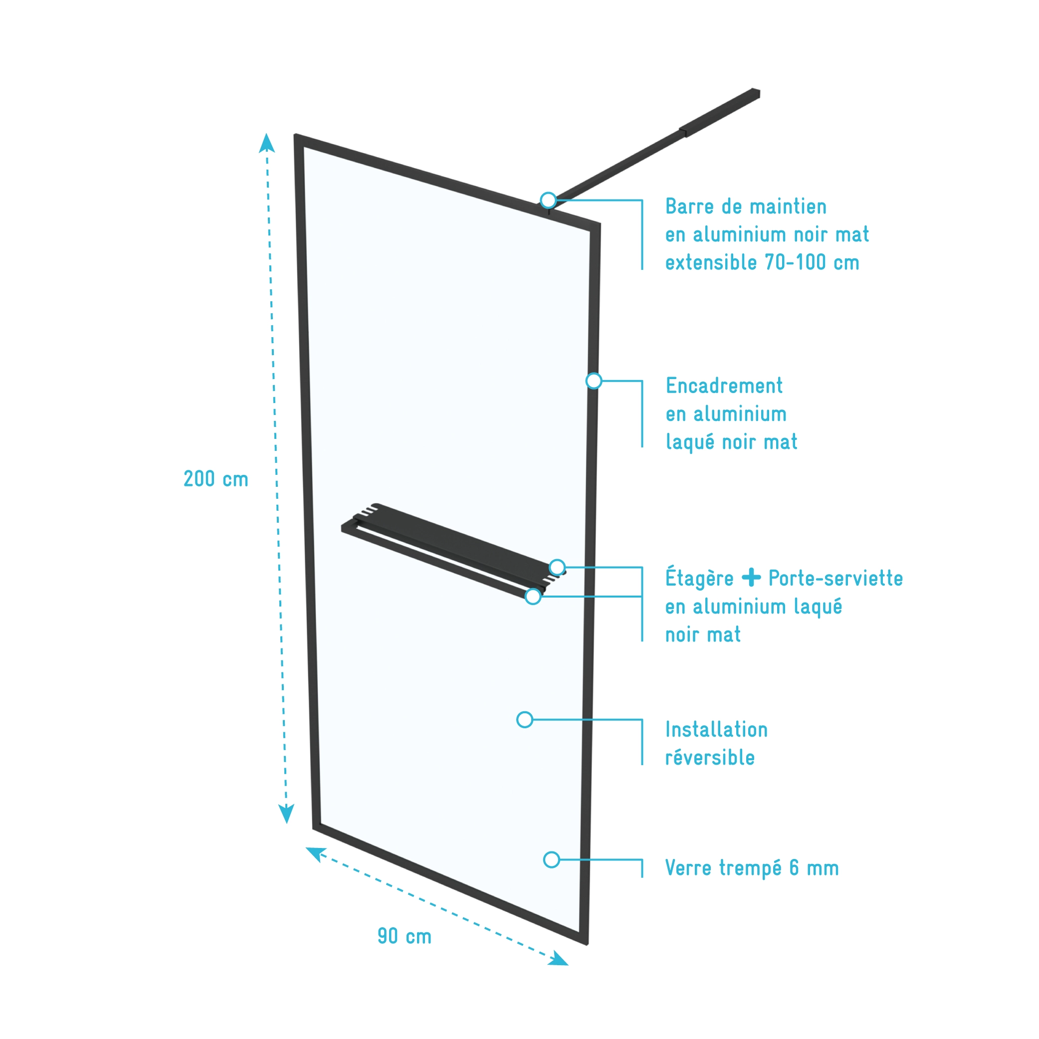 Paroi de Douche 90x200cm en Verre Trempé Transparent 8mm Anticalcaire - Profilé Noir Mat - LINA