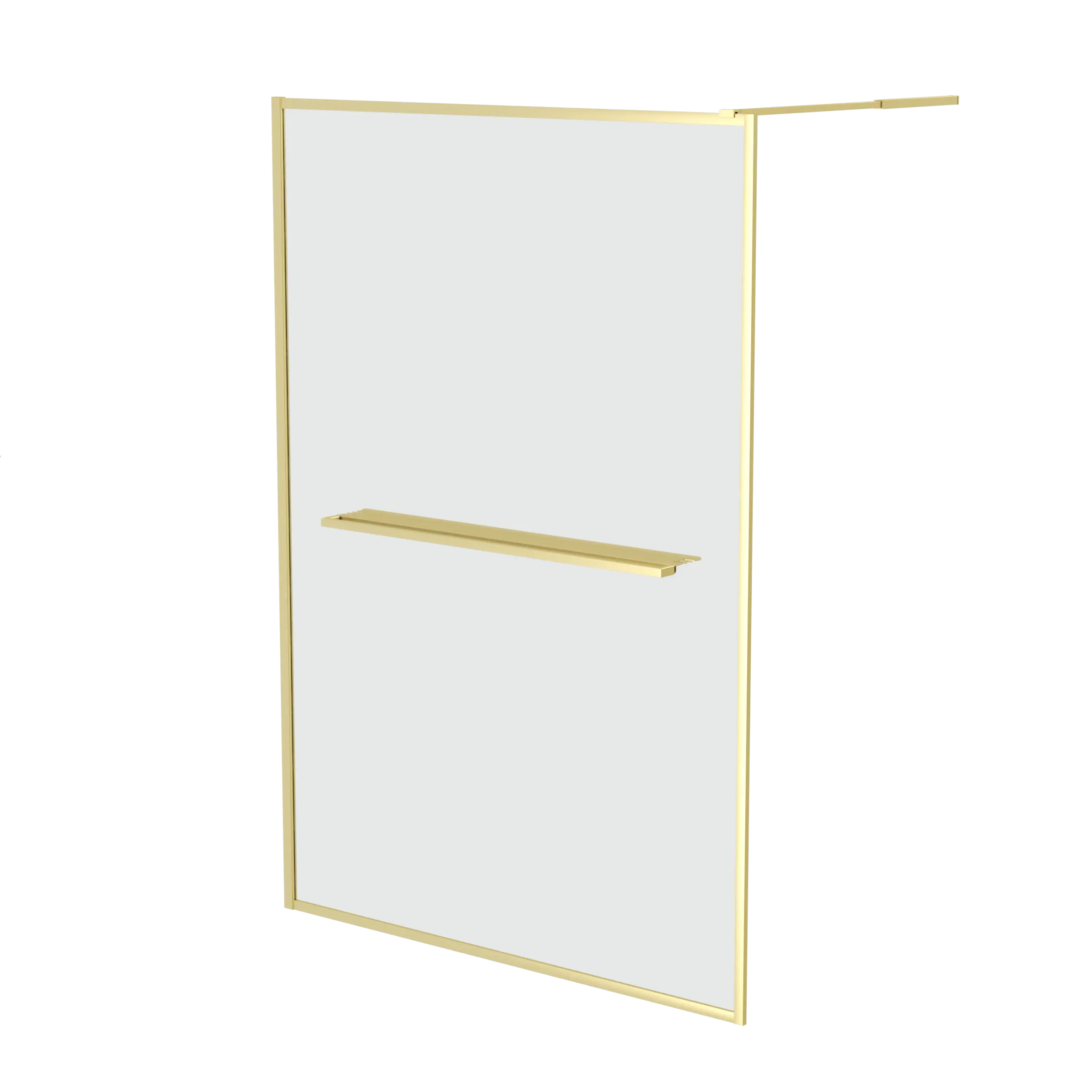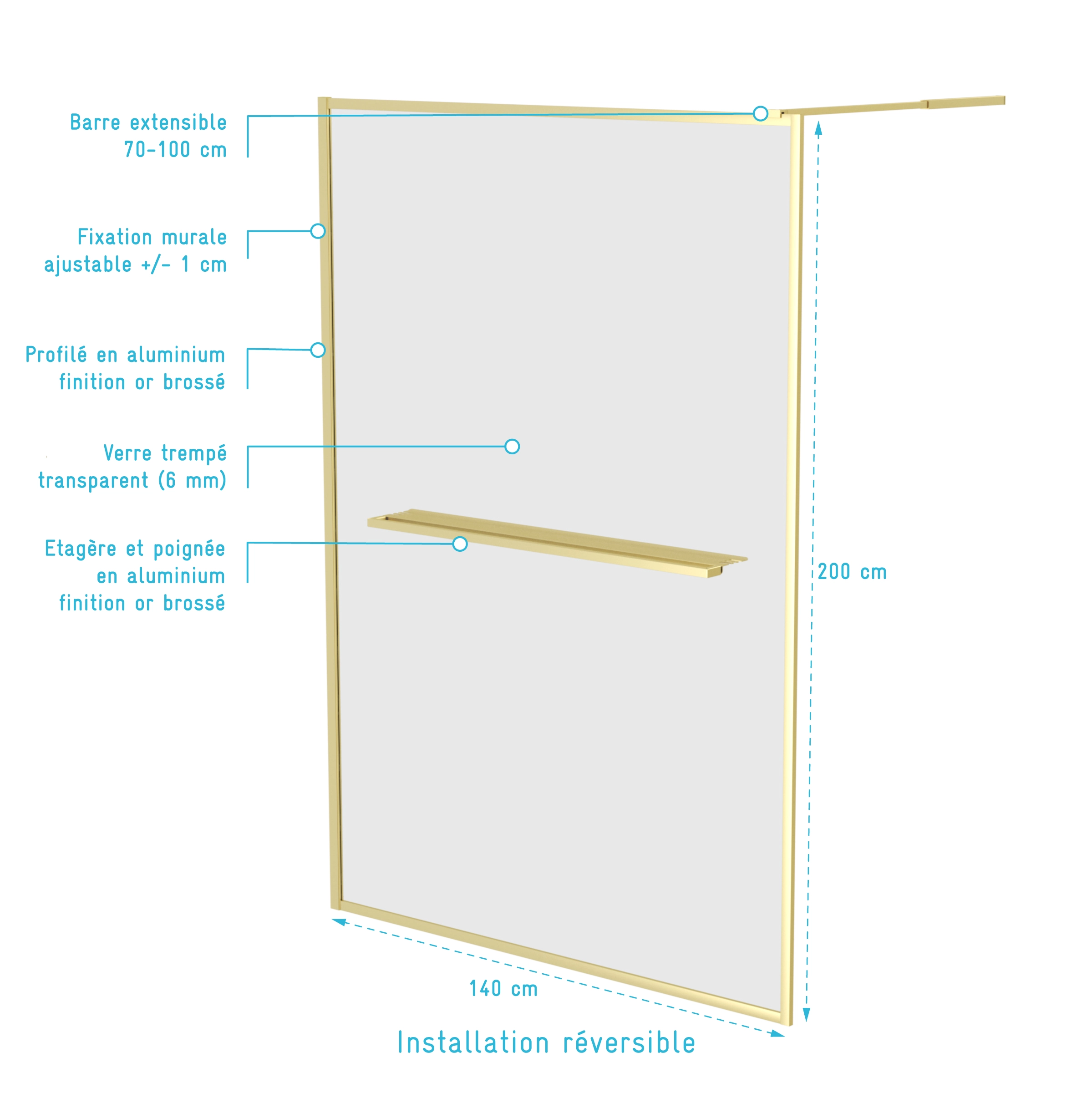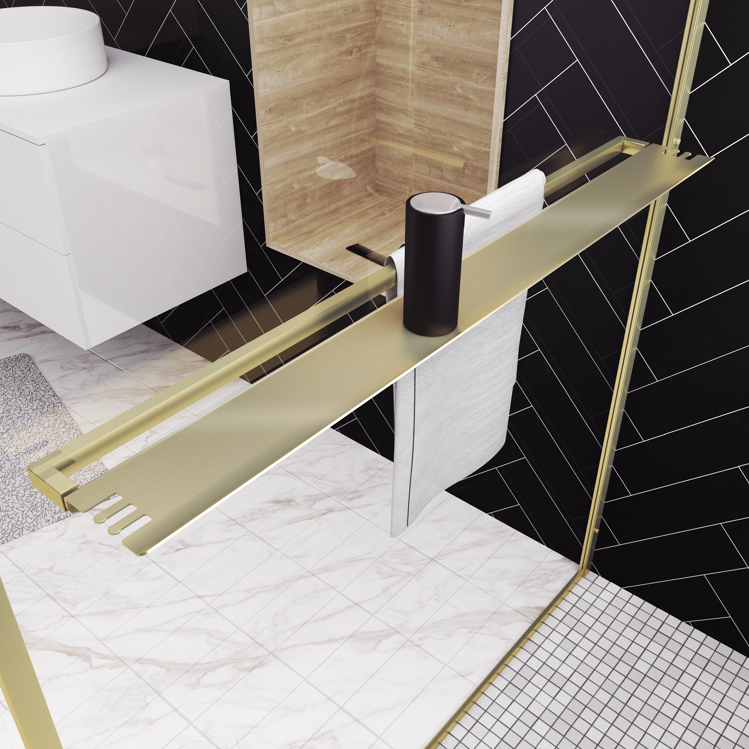 Vous l’attendiez avec impatience ! Succombez à la nouvelle paroi de douche fixe à l’encadrement finition or brossé 3-en-1: paroi, porte-serviette et étagère. La paroi de douche à l’italienne, moderne et incontournable, a l’avantage de faciliter l’accès à la douche ainsi que de rendre votre pièce plus lumineuse et spacieuse.