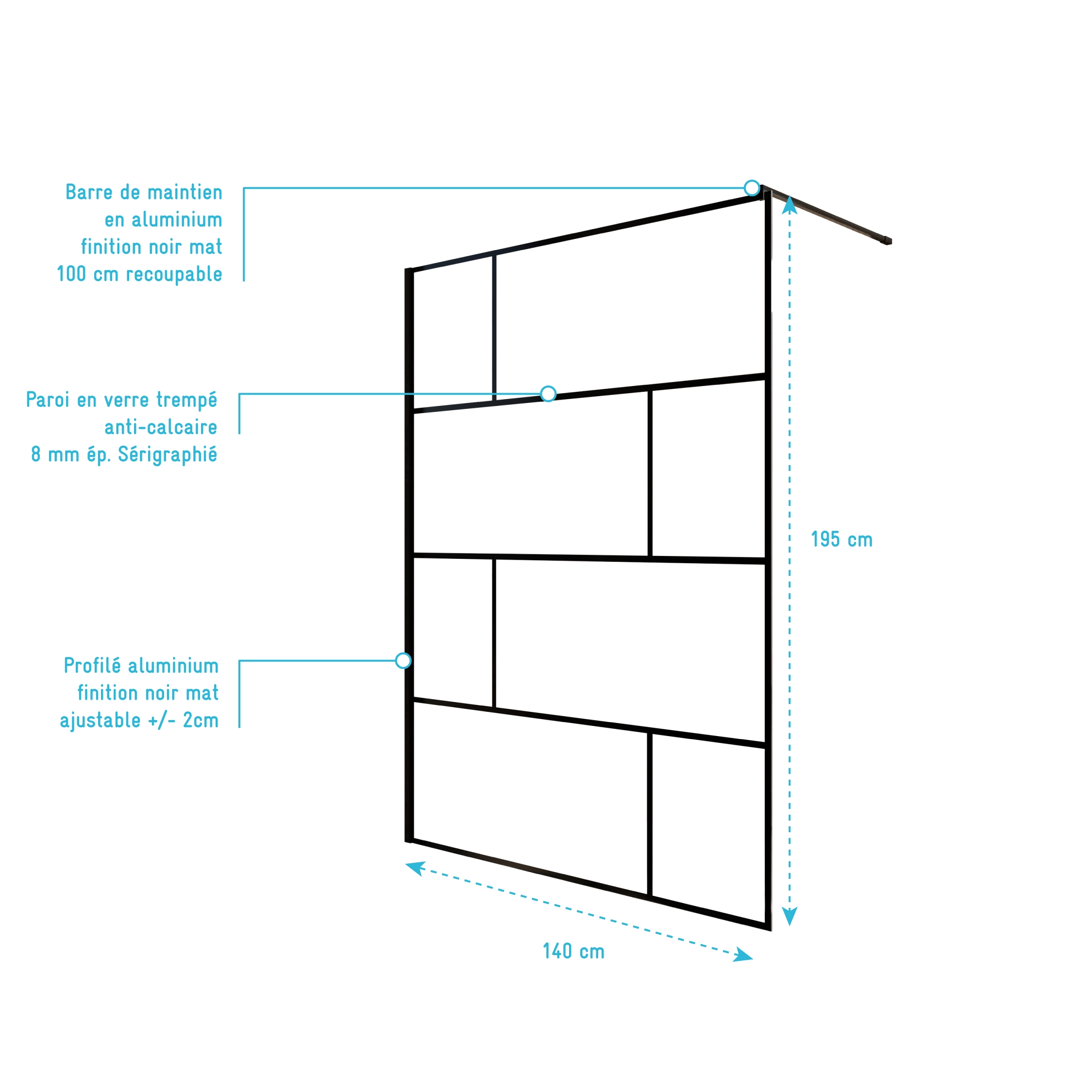 Paroi de Douche Serigraphie Brique 140x195cm - Verre Anticalcaire 8mm - Profilé Noir Mat