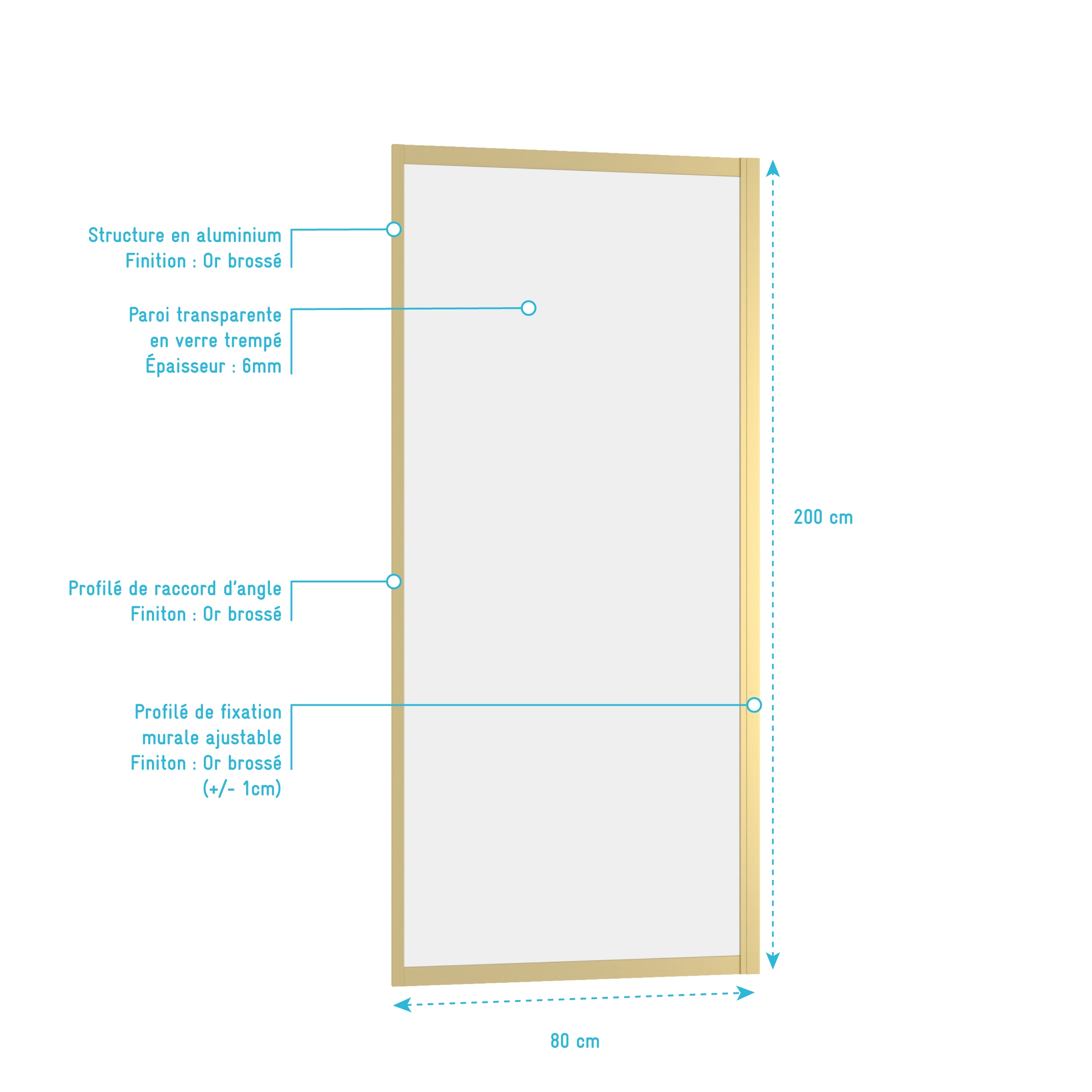 Paroi de retour 80x200cm – Profilés Or Doré Brossé – Verre Trempé 6mm – GOLDY CRUSH