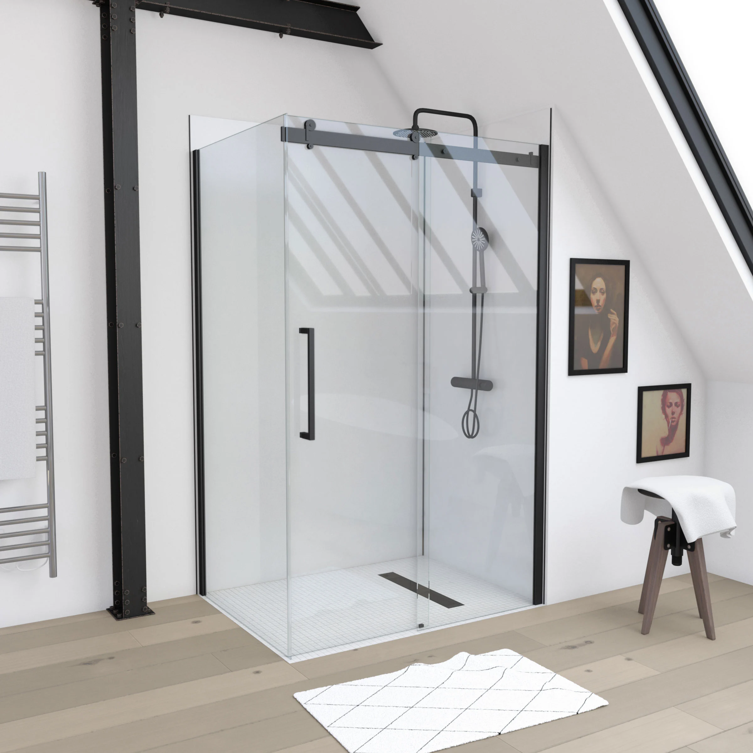 • 1 Paroi de retour de douche type industriel en verre trempé 8mm transparent