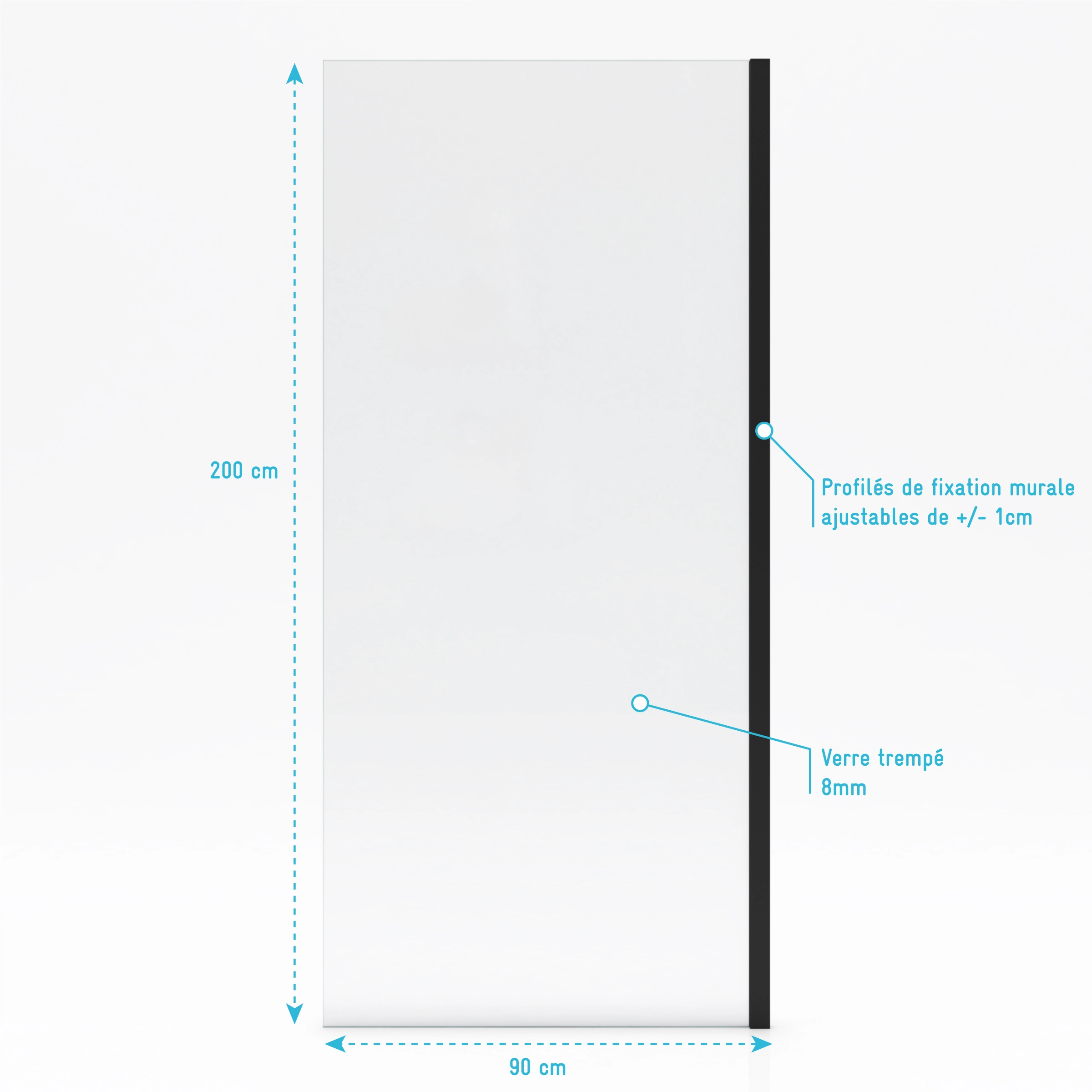 • Paroi de retour pour Paroi porte de douche type industriel NOIR MAT - 90x200cm - verre trempe 8mm