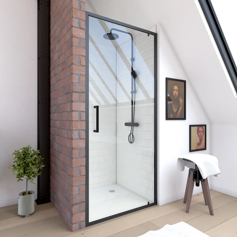 Porte de douche pivotante – 90×200 cm – Profilés Noir Mat – verre trempé 6 mm – CRUSH