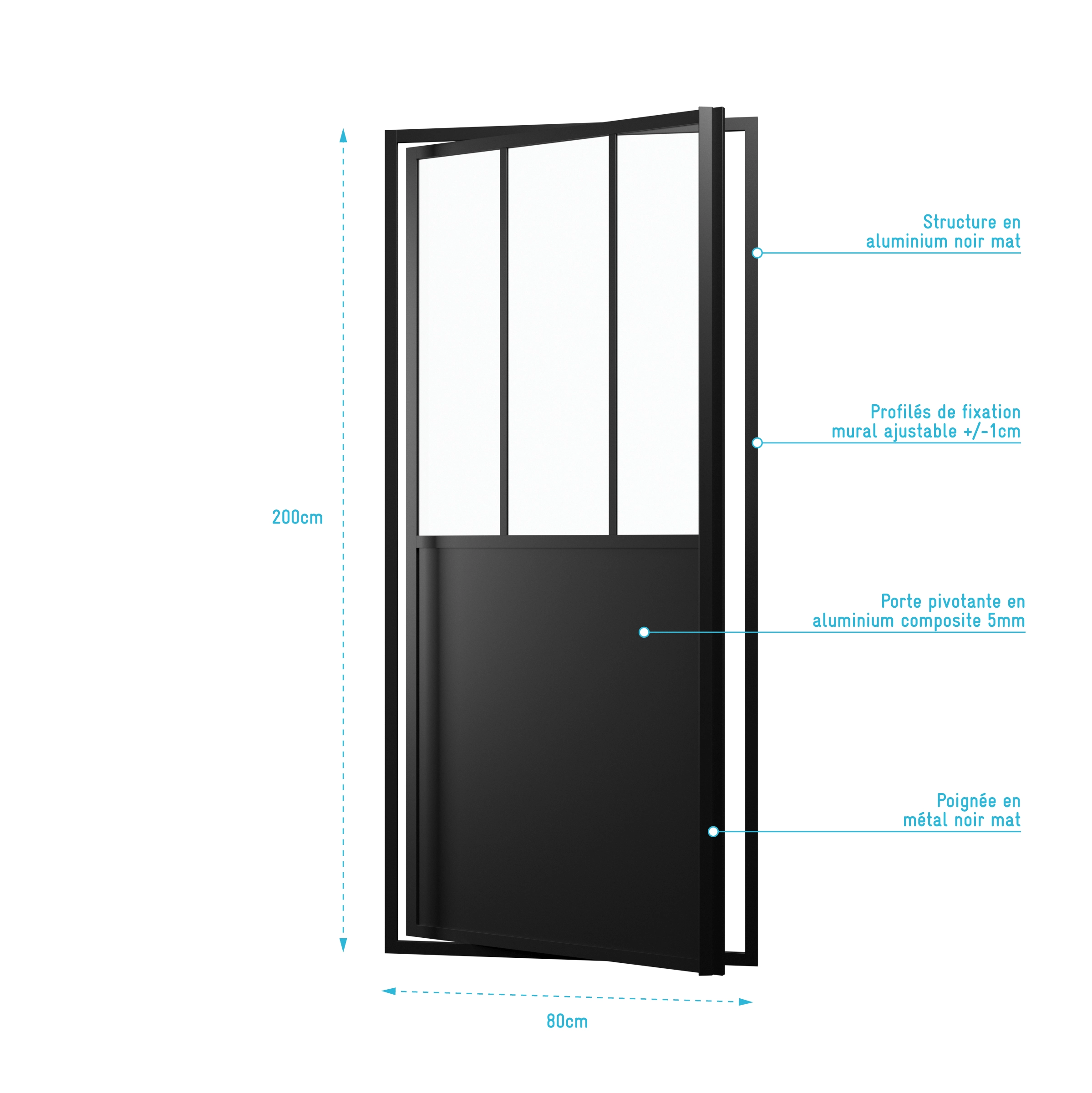 Paroi porte de douche a porte pivotante type atelier - 80x200cm - PROFILE NOIR MAT - verre 5mm