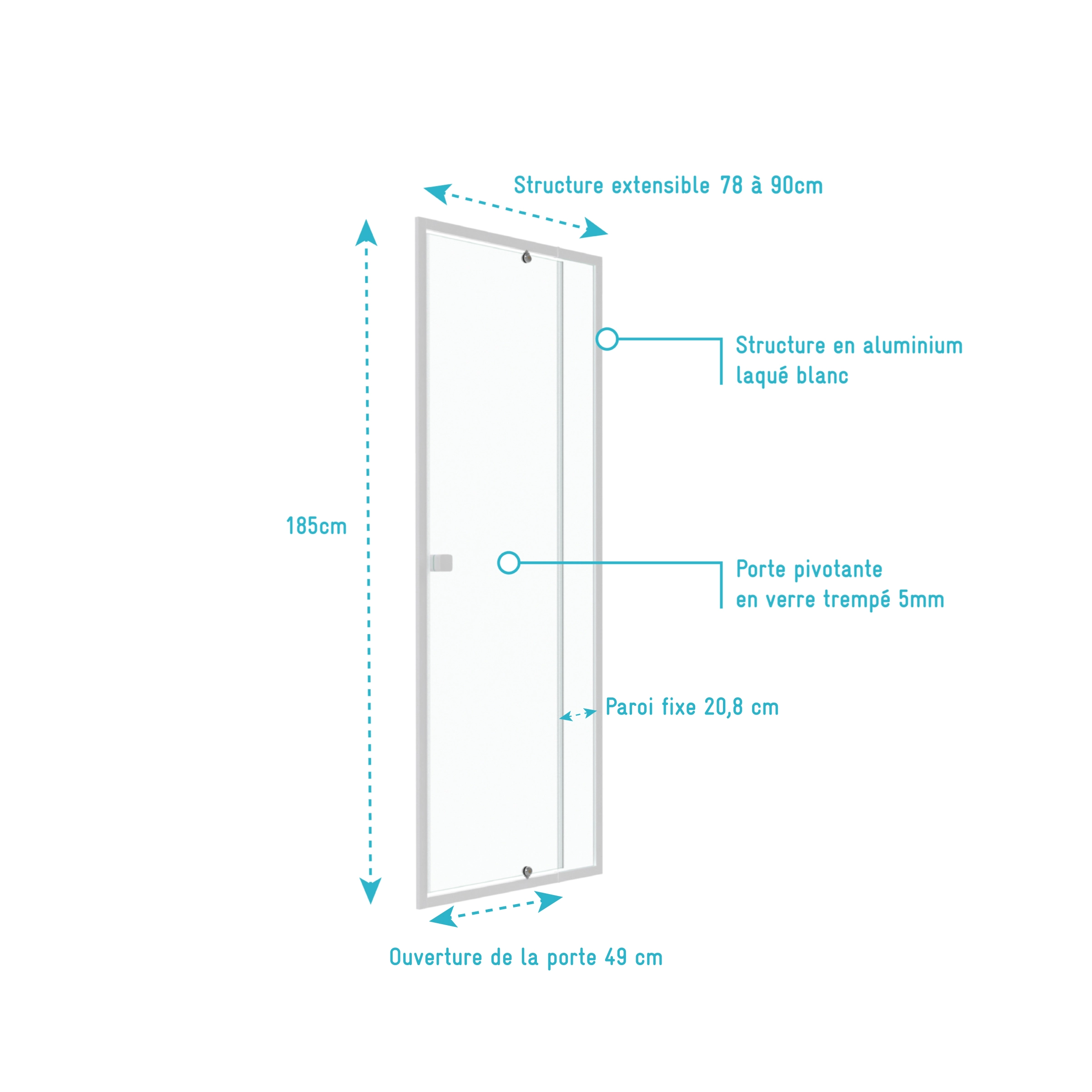Porte de douche pivotante ajustable de 78 à 90cm en Alu. Blanc et verre transparent - WHITY PIVOT