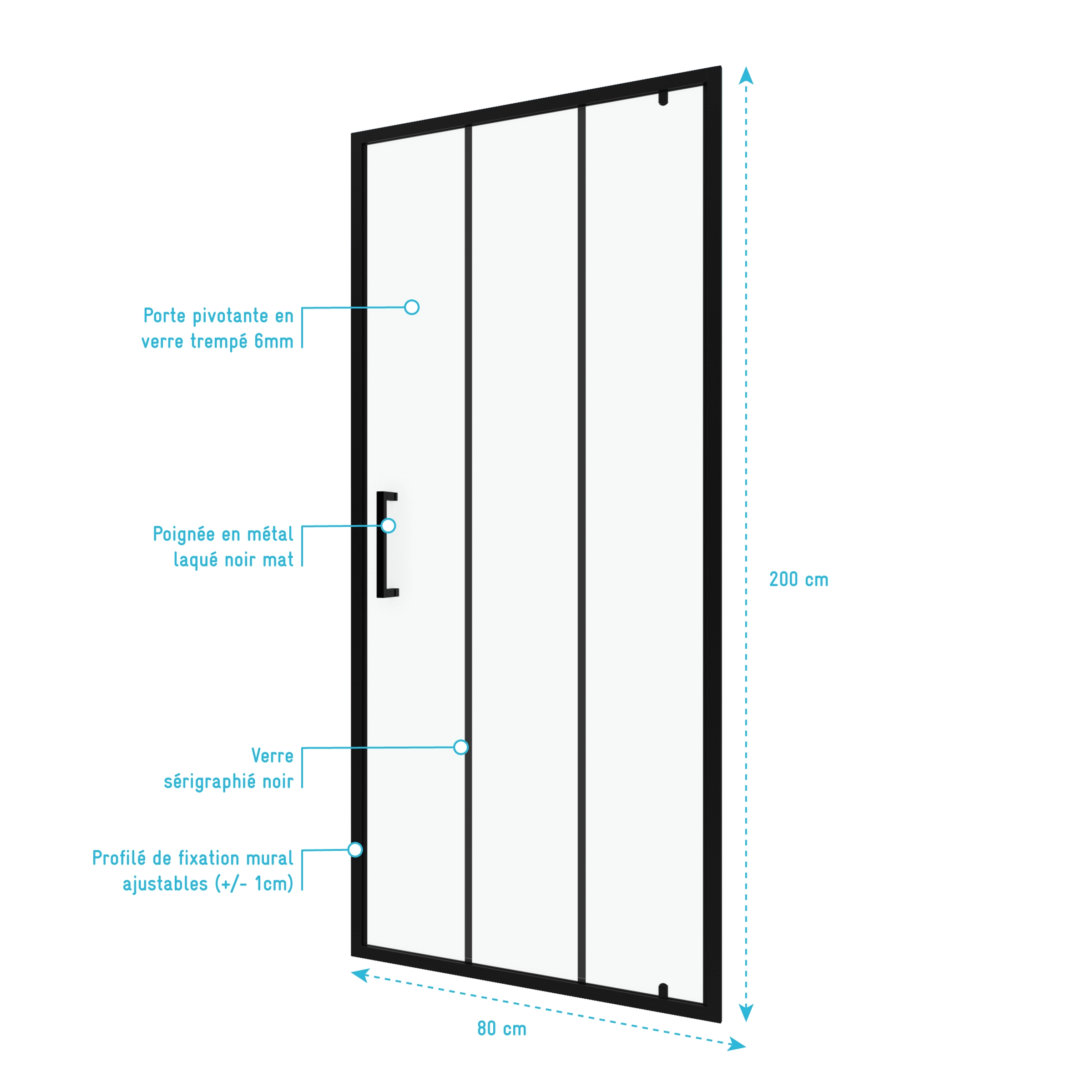 3 avis pour Paroi porte de douche pivotante type industriel – 80x200cm – PROFILE NOIR MAT – verre 6mm