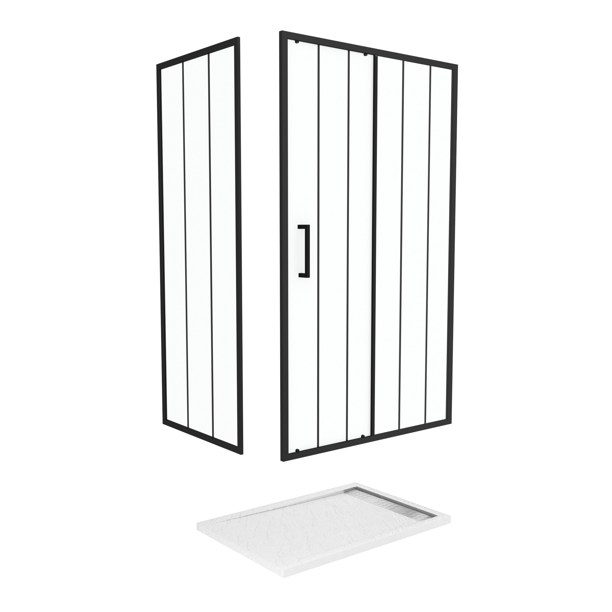 Ensemble comprenant une porte de douche coulissante, ainsi qu’une paroi de retour et un receveur Blanc Effet Pierre en acrylique avec une grille linéaire.