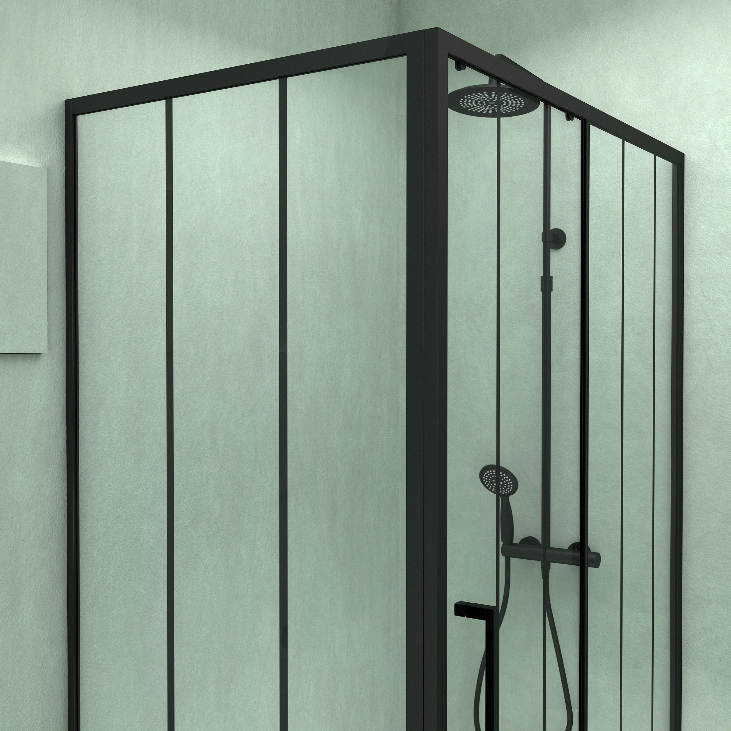 - Paroi de retour en verre trempé 6 mm avec une sérigraphie linéaire Noire (Dim. 80×200 cm)
