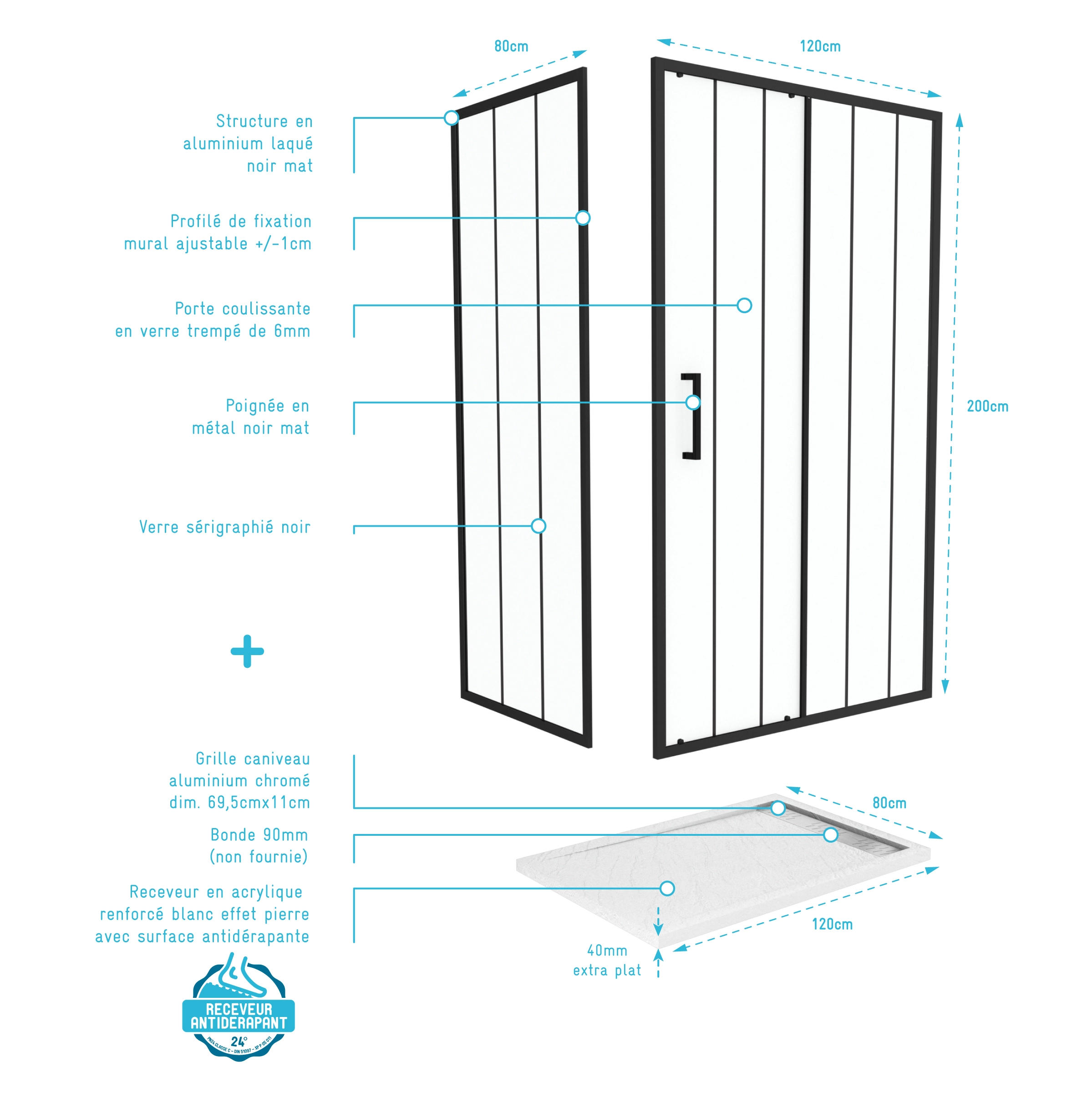 0 avis Porte Coulissante et Retour avec Sérigraphie Noire 120x80x200cm + Receveur en SMC Blanc Effet Pierre