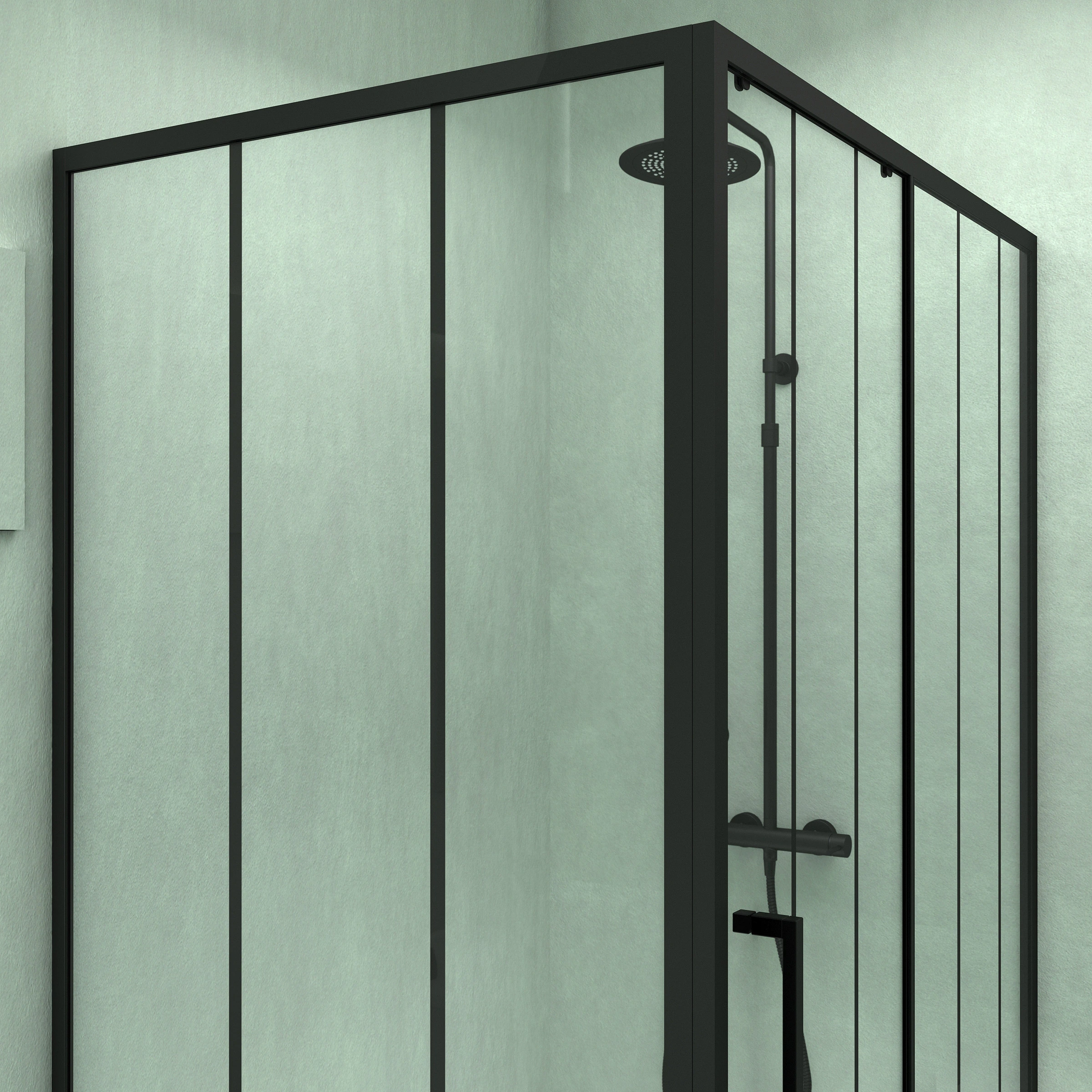 - Paroi de retour en verre trempé 6 mm avec une sérigraphie linéaire Noire (Dim. 90×200 cm)
