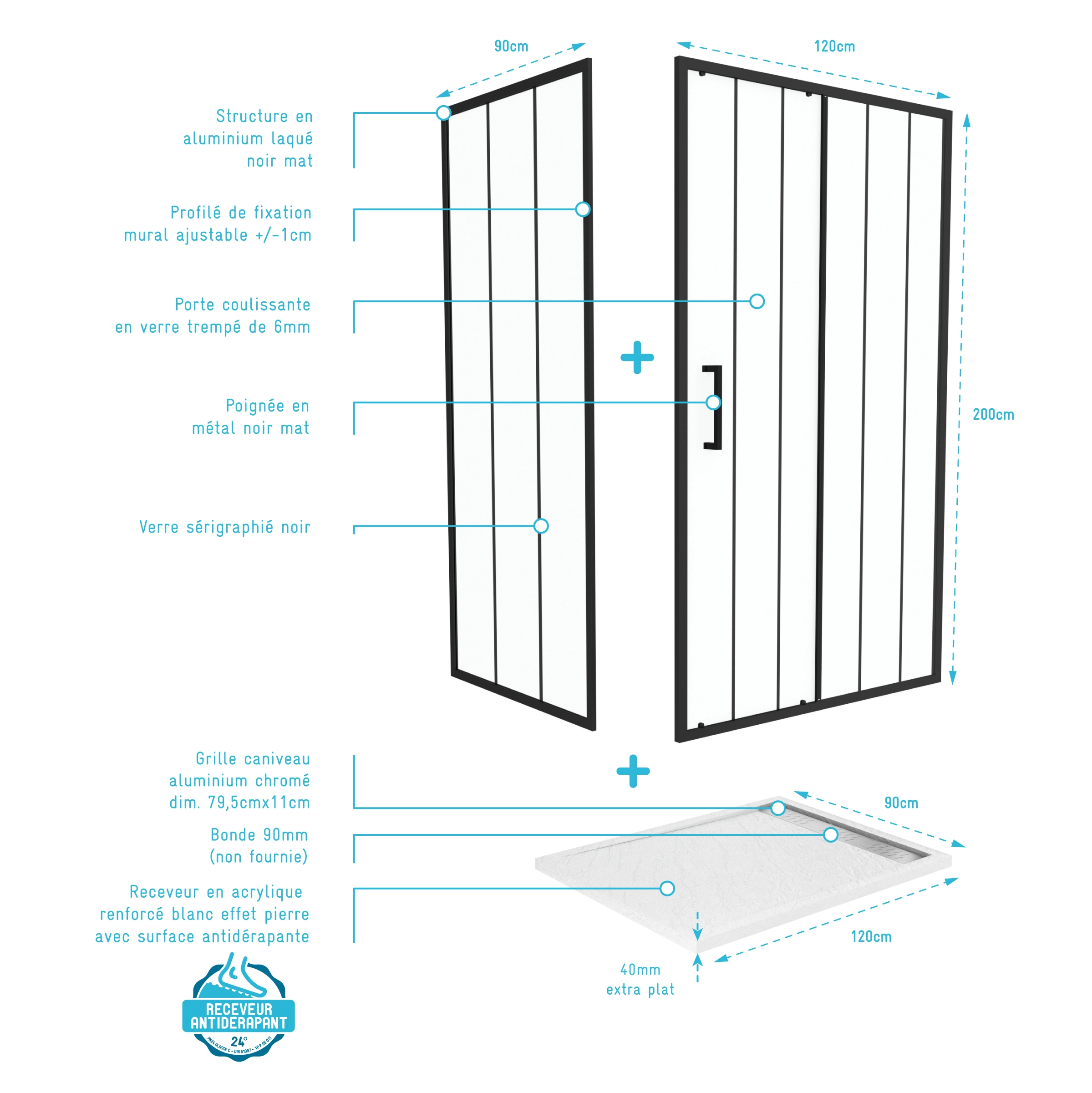 Porte Coulissante et Retour avec Sérigraphie Noire 120x90x200 cm + Receveur Blanc Effet Pierre
