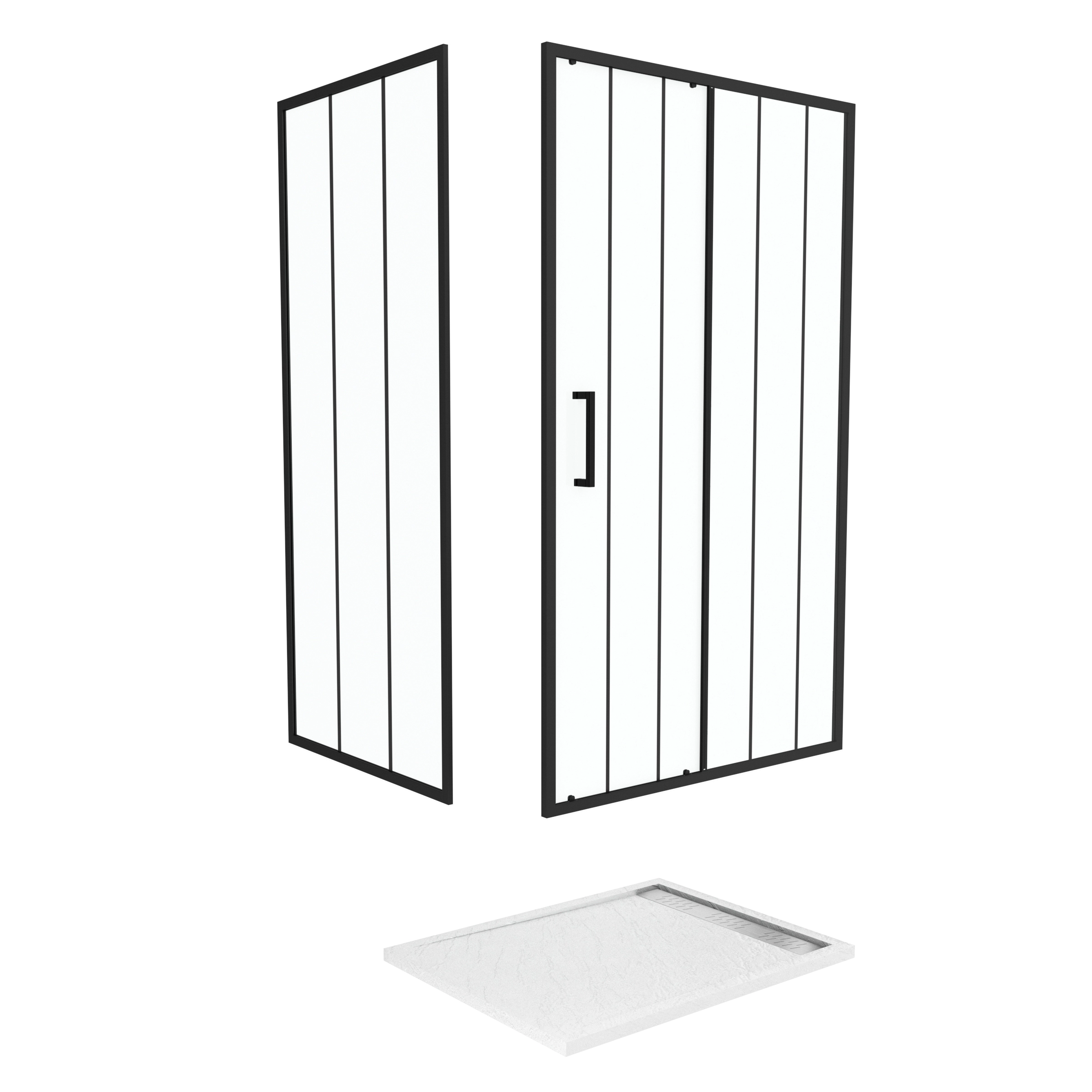 Ensemble comprenant une porte de douche coulissante, ainsi qu’une paroi de retour et un receveur Blanc Effet Pierre en acrylique avec une grille linéaire.