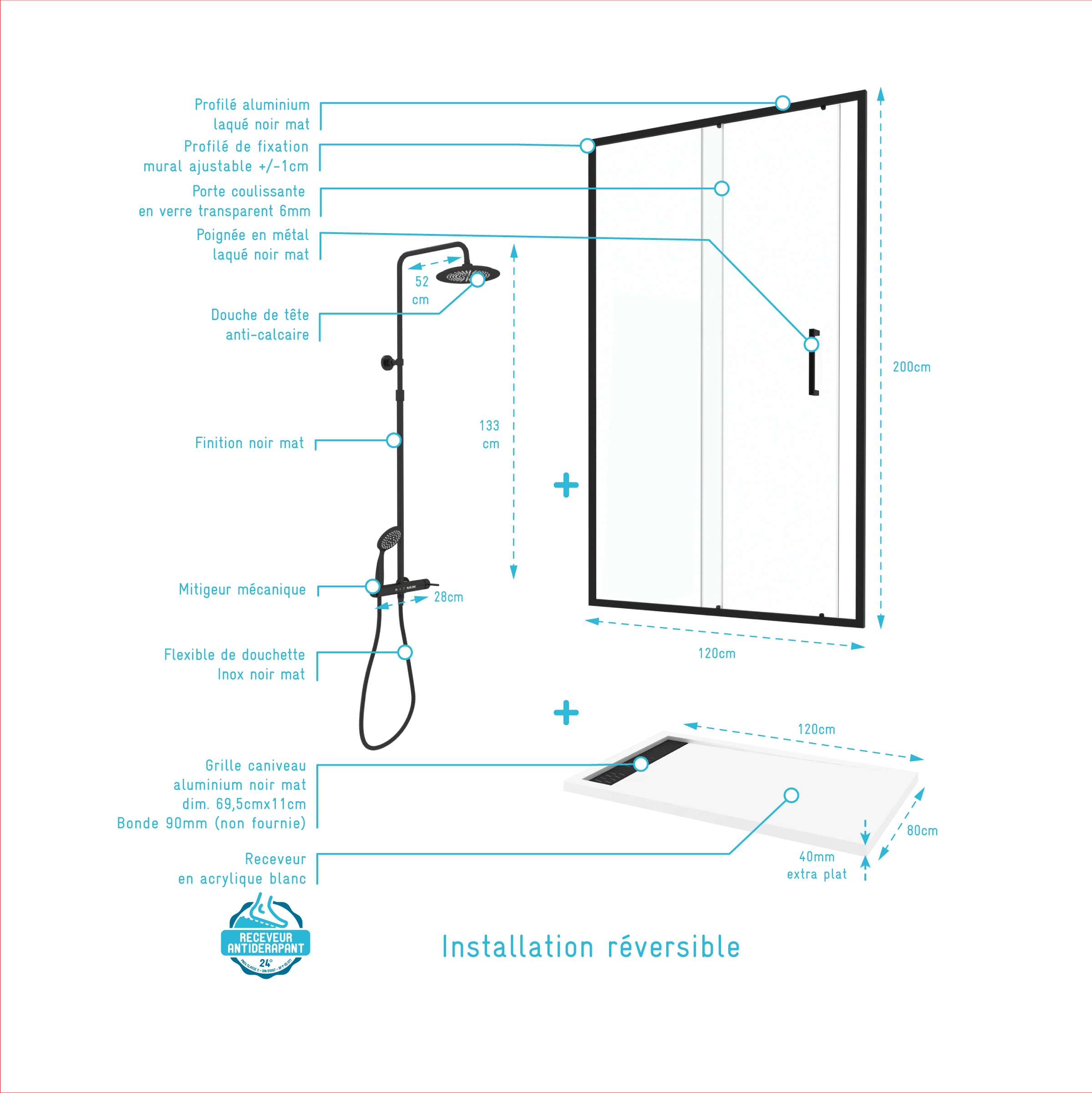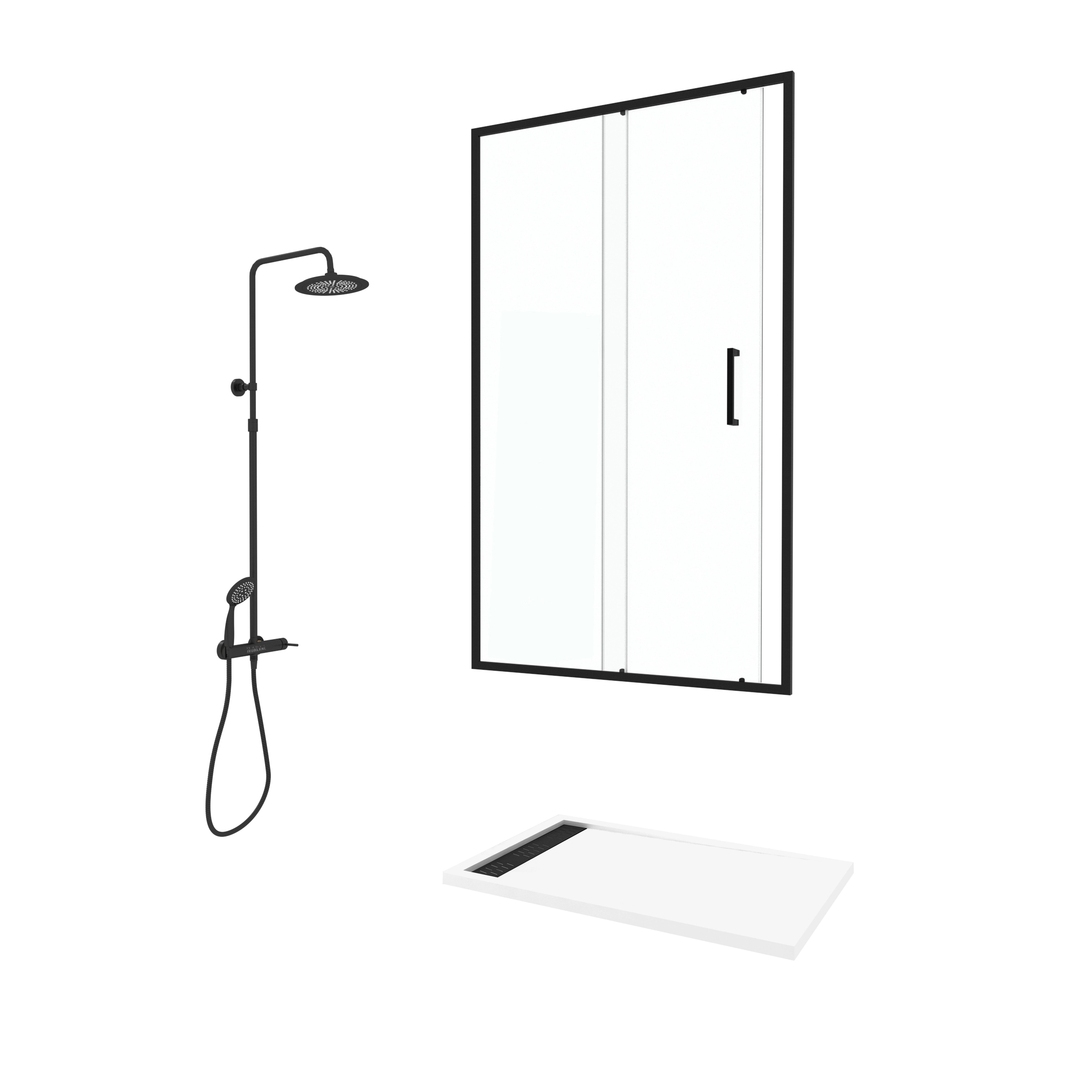 Pack Porte Coulissante Noir Mat + Receveur Blanc 120x80x204 cm et Colonne de Douche Thermostatique