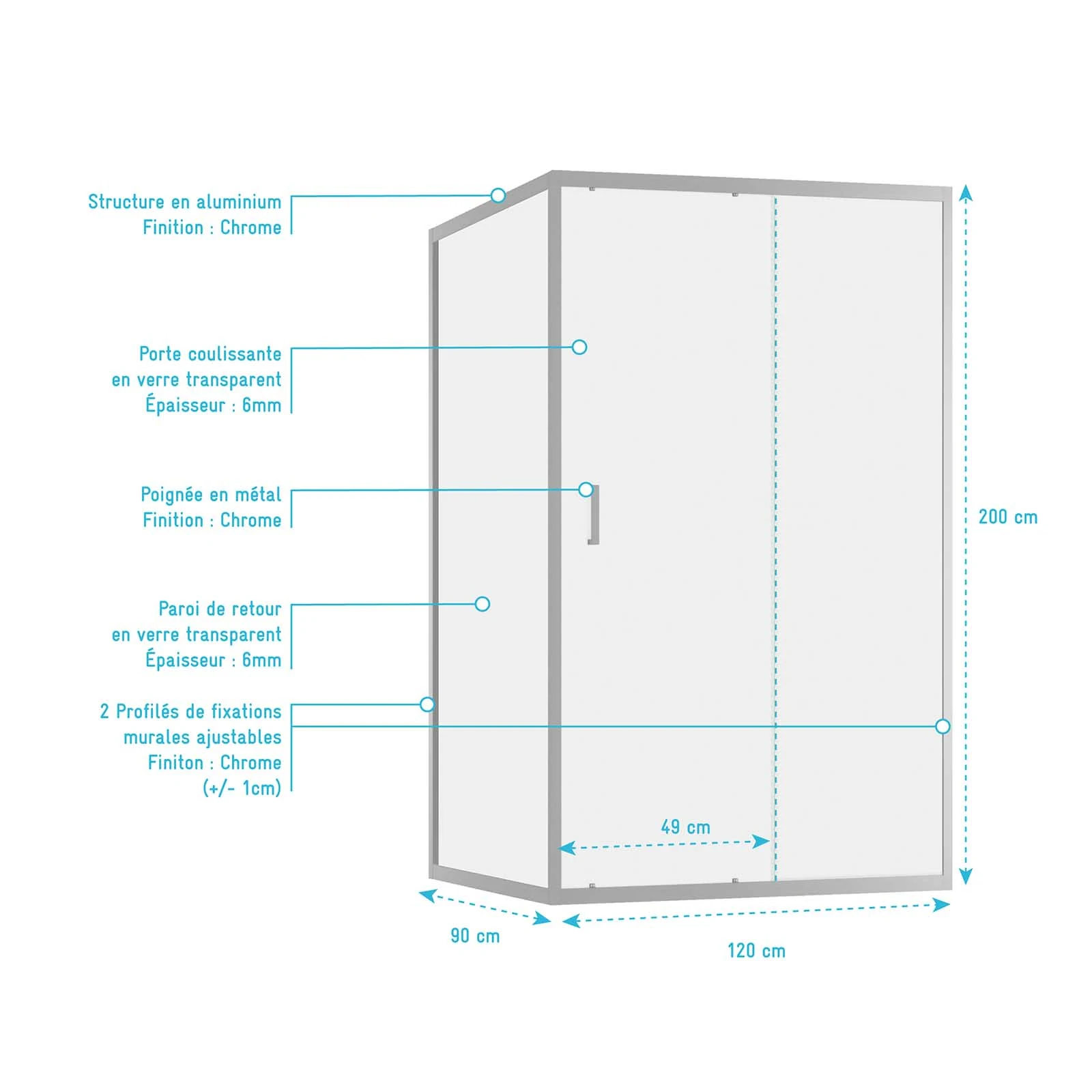 Porte de Douche Coulissante et Retour 120x90x200cm – Profilés Chrome – Verre trempé 6mm