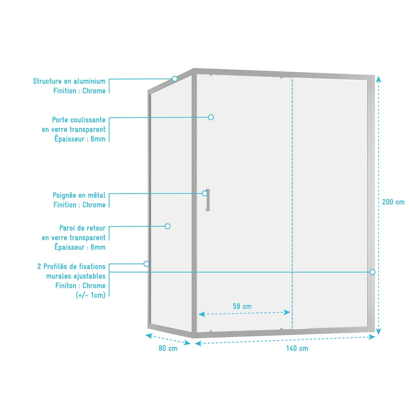 Porte de Douche Coulissante et Retour 140x80x200cm – Profilés Chrome – Verre trempé 6mm