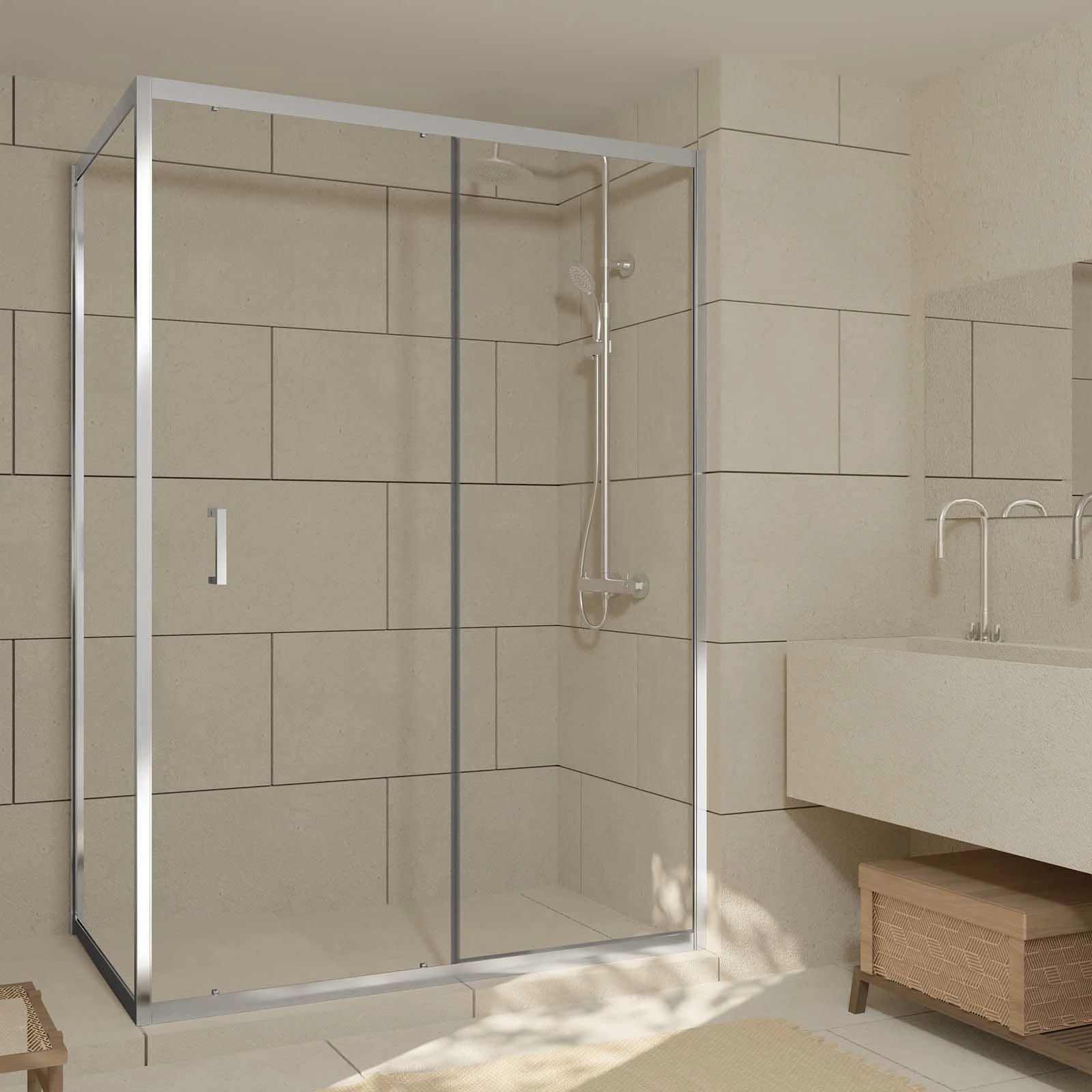 Porte de Douche Coulissante et Retour 140x90x200cm – Profilés Chrome – Verre trempé 6mm