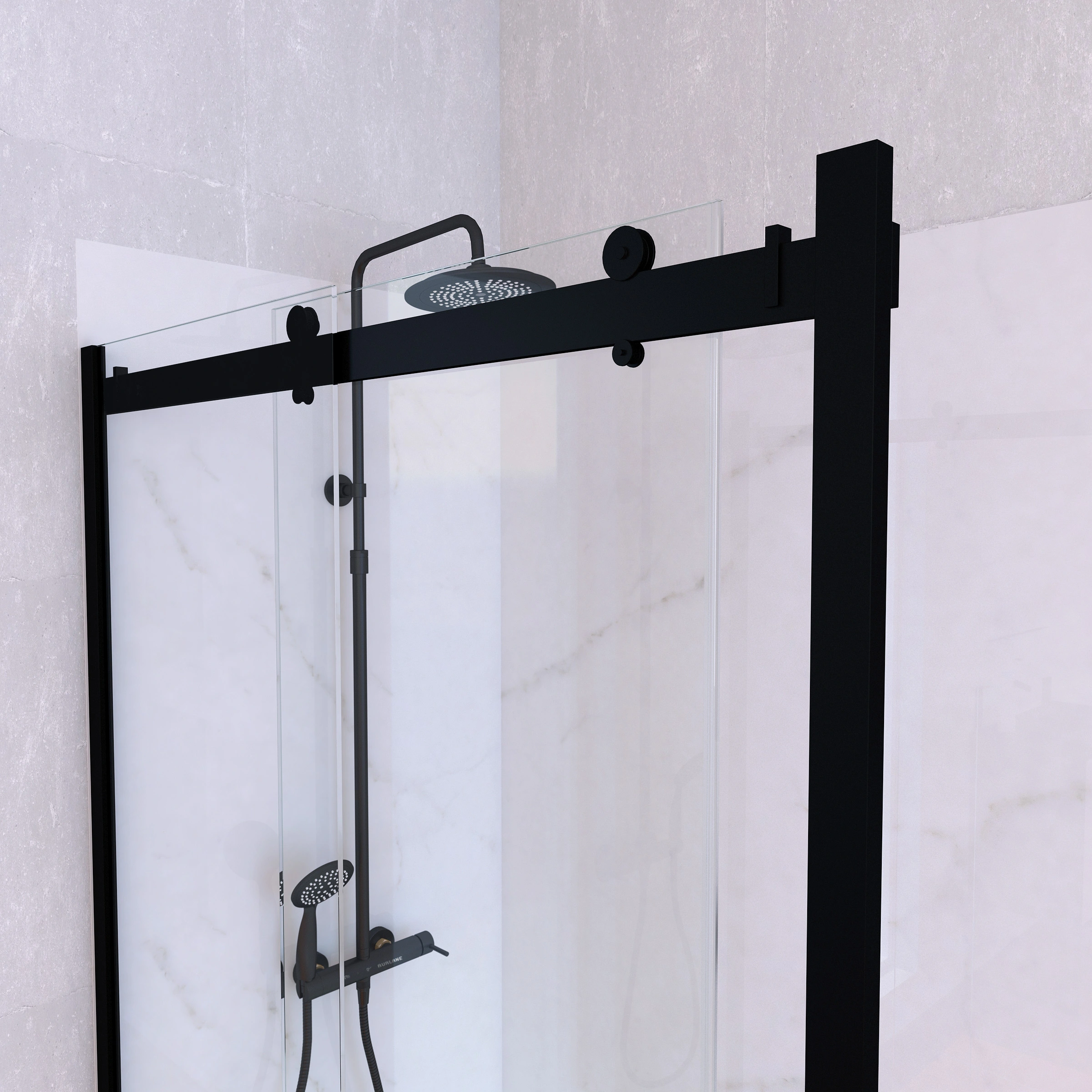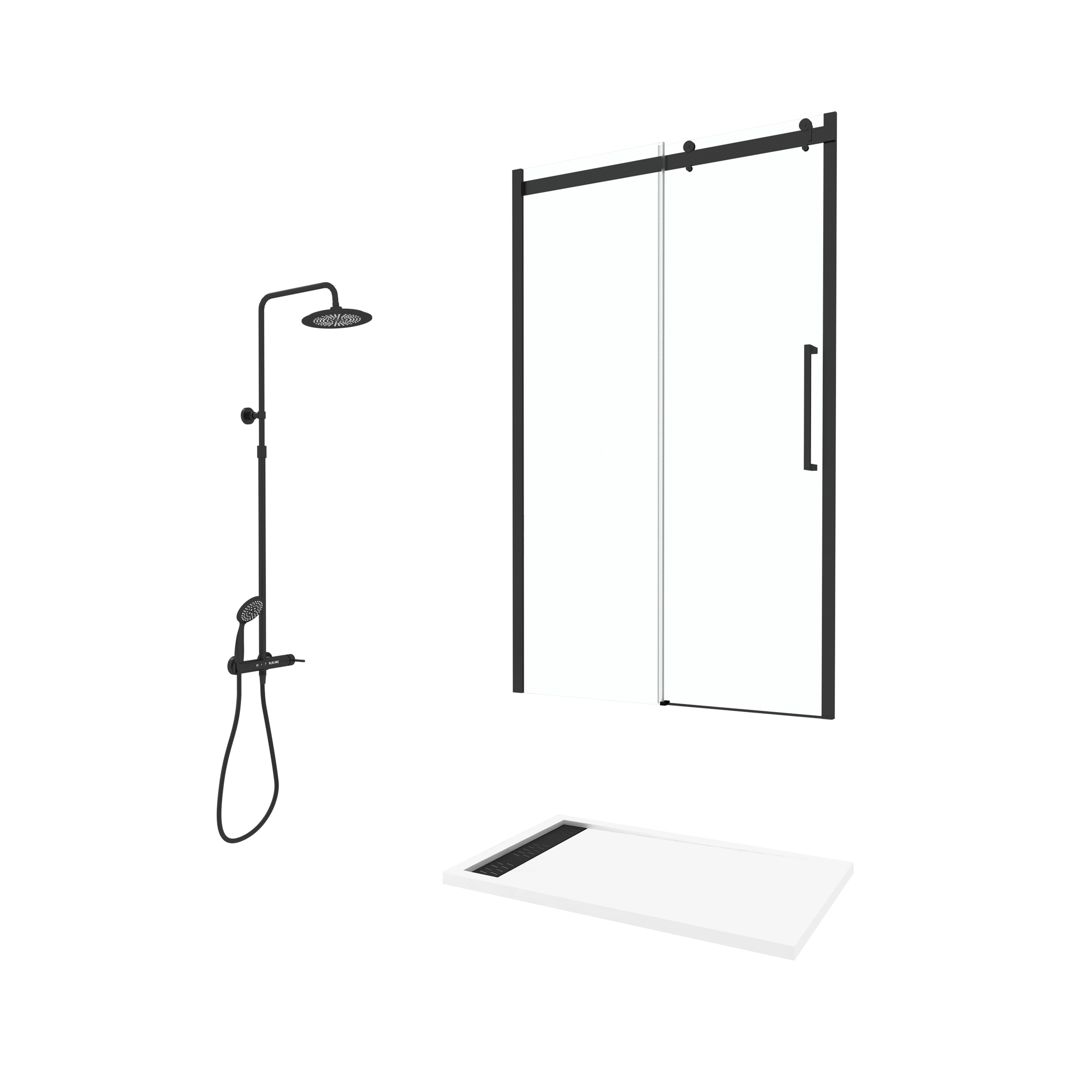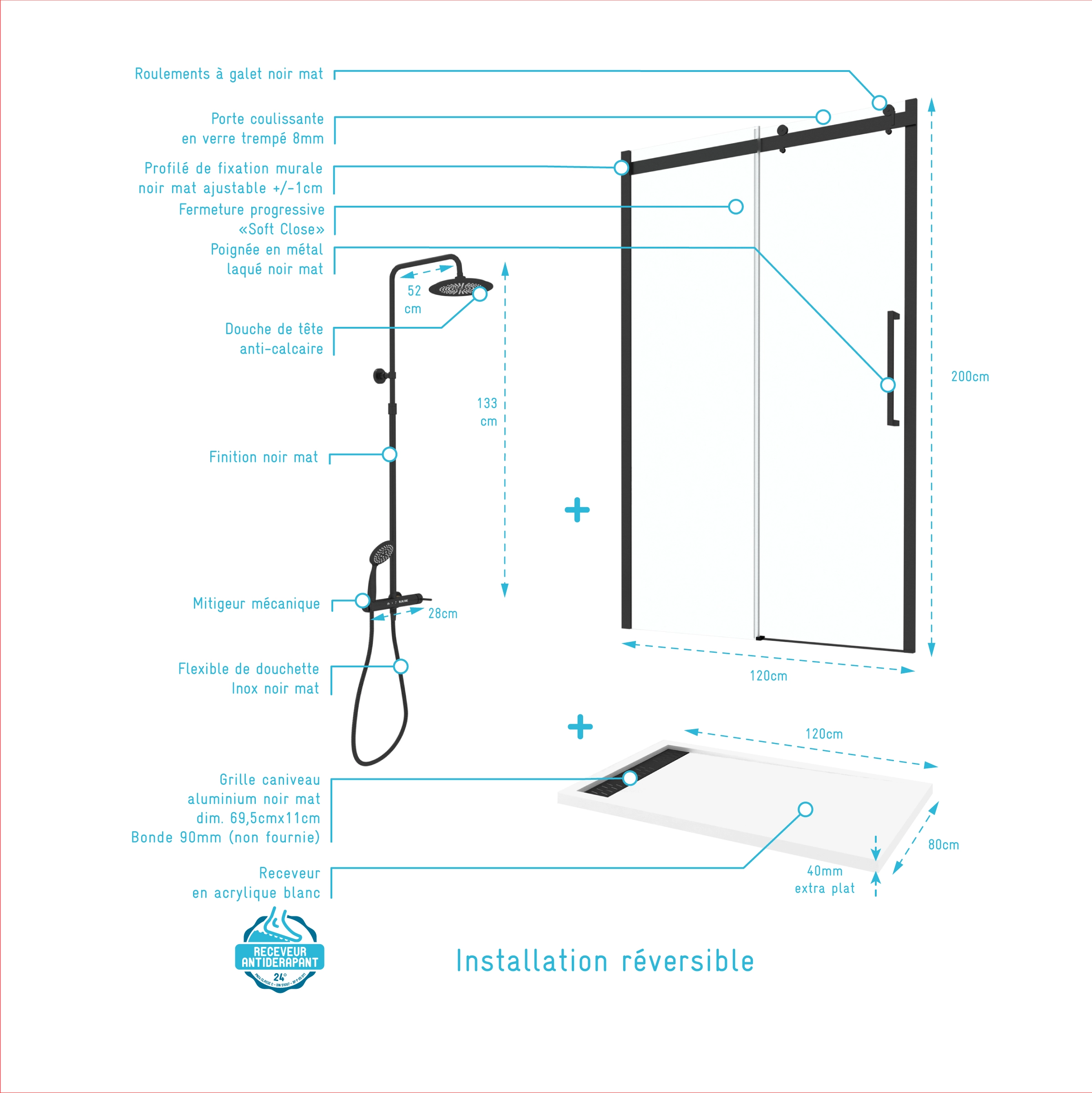 Ensemble comprenant une porte de douche coulissante type ‘INDUSTRIEL’ Noir Mat, un receveur en acrylique Blanc à grille linéaire et une colonne de douche Mécanique.