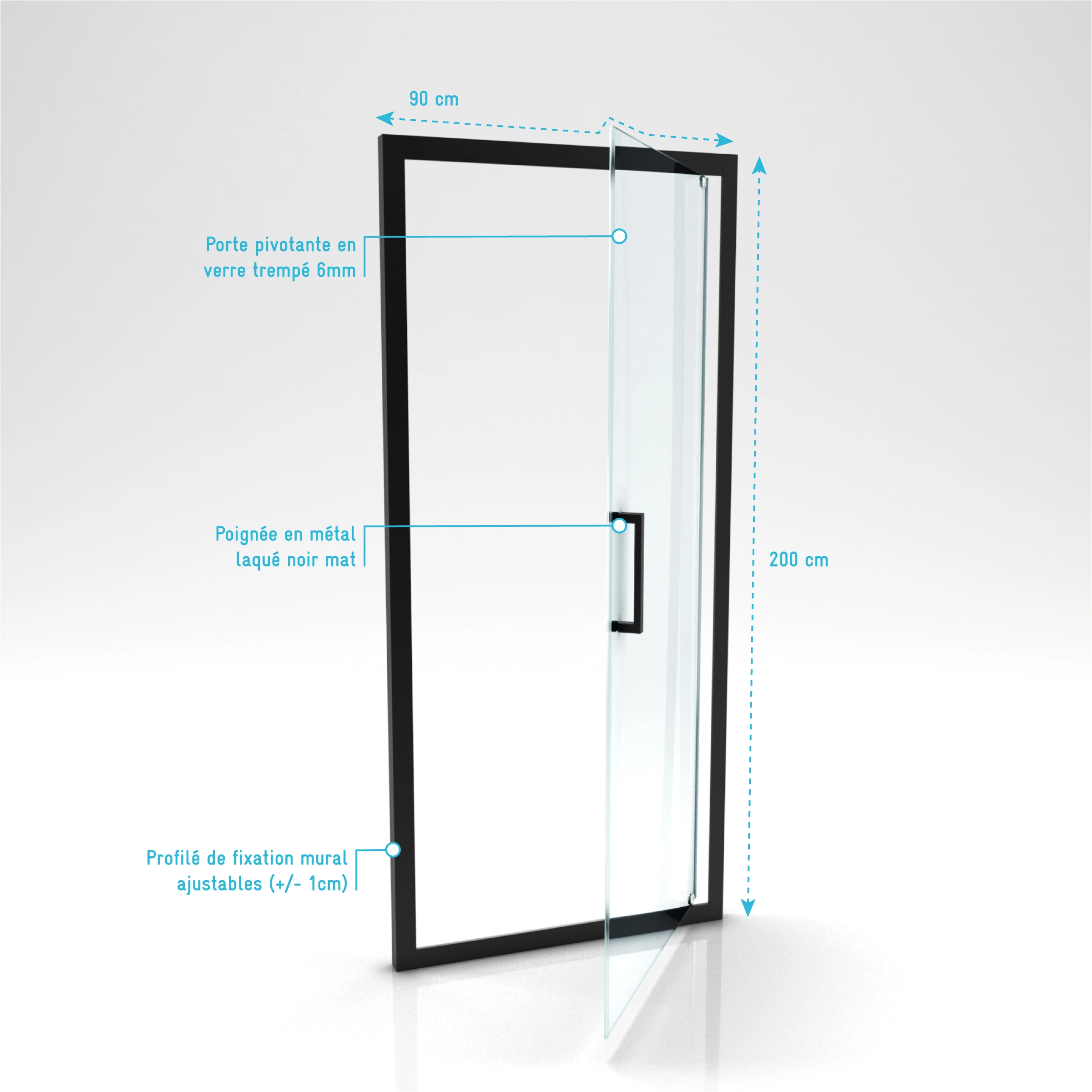 2 avis pour Porte de douche pivotante – 90×200 cm – Profilés Noir Mat – verre trempé 6 mm – CRUSH