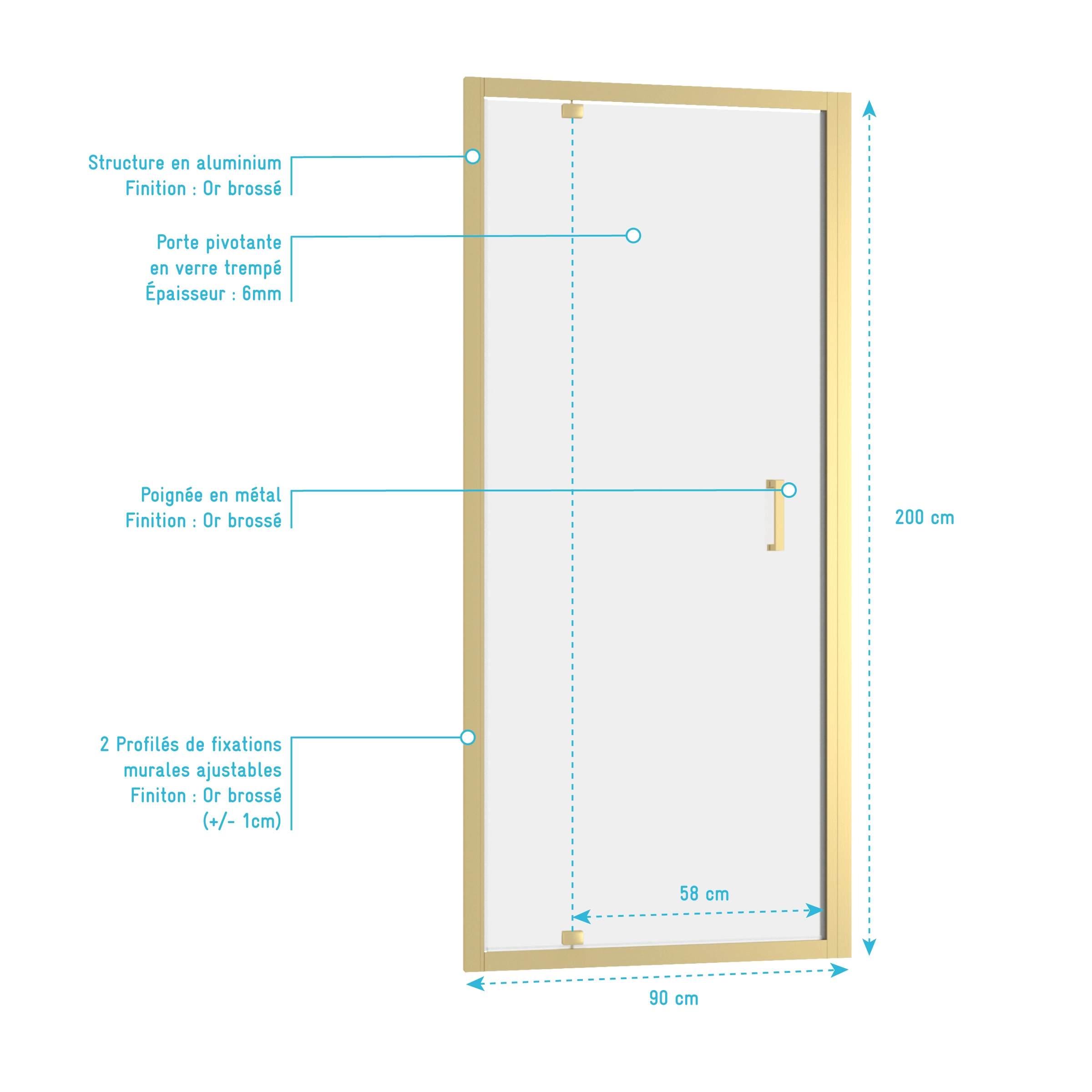 Transformez votre salle de bains avec cette porte de douche dorée pivotante 90x200cm, pour une entrée de douche moderne aux finitions or brossé élégantes.